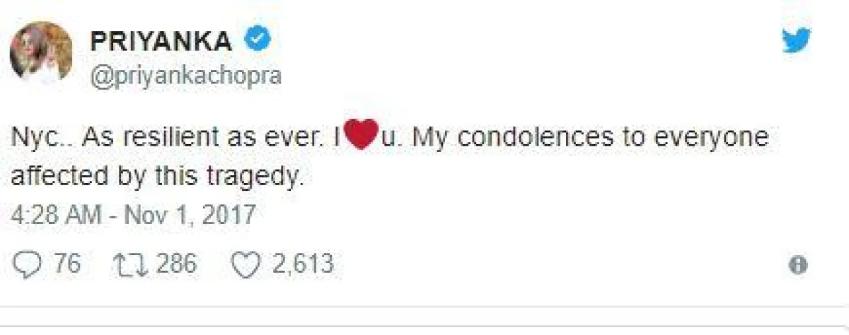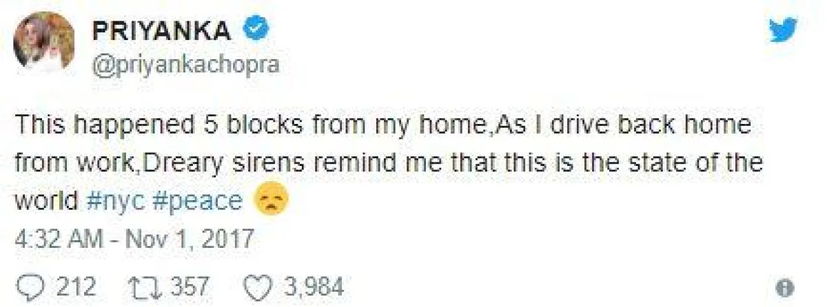 وأضافت التفاصيل أنّ بريانكا كانت تبعد عن وقوع الحادث فقط خمسة شوارع، حيث غرّدت على حسابها الخاص في تويتر مستنكرةً الحادث الإرهابي، ومقدّمةً تعازيها لأهالي الضحايا الذي قضوا بالحادث.