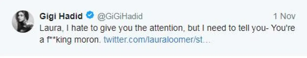 ولكن التغريدة التي كتبت فيها لورا: "كم من الناس يجب أن يموت قبل أن ندرك أن الإسلام سرطان، وعلينا أن نمنع المسلمين من التواجد في العالم المتحضر"، أثارت حفيظة جيجي حديد التي تدخلت وردّت عليها بالقول: "لورا، أكره أن أُعيرك أيَّ اهتمام، لكن أريد أن أقول لك أنك (...) خرقاء".