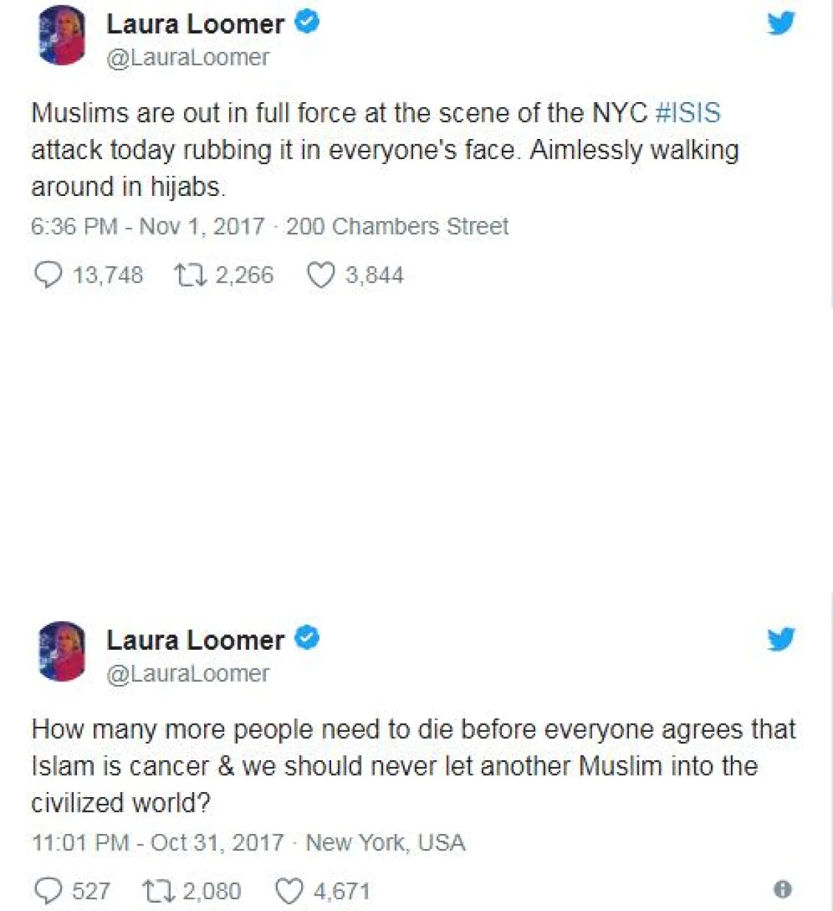 وعرّفت لورا عن نفسها في إحدى التغريدات بـ"الإسلاموفوبية الفخورة"، نسبة إلى المصطلح الذي يعني الخوف من الإسلام والمسلمين، مشيرة إلى أنه "لا يوجد أي شيء اسمه إسلام معتدل المسلمون جميعهم سواء".