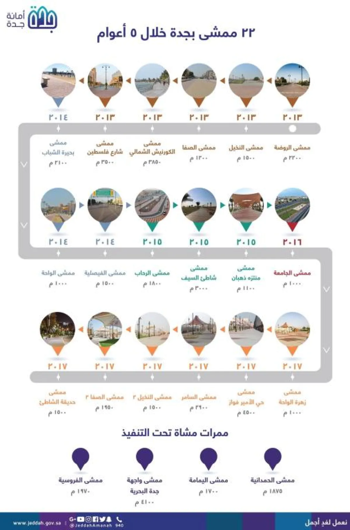 الجدير بالذكر أن أمانة محافظة جدة قامت بتنفيذ (18) ممشى في محافظة جدة، تتخطى أطوالها 50 ألف متر، وموزعة على نطاق 14 بلدية فرعية، وتم تجهيزها وفق أحدث المشاريع الرياضية وزودت بالخدمات اللازمة والتي كان آخرها ممشى حديقة الشاطئ بطول 1500م.