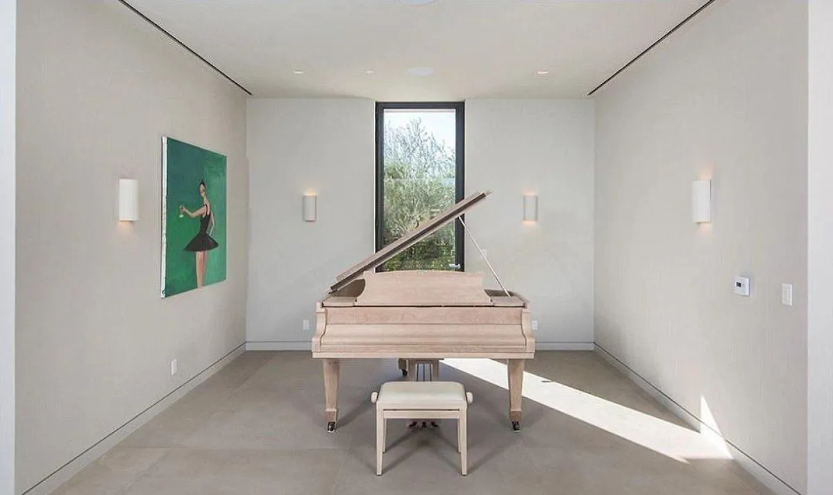 خصَّص النجمان ركنًا للموسيقى، تتوسَّطه آلة الـ"بيانو" المُغلَّفة بالخشب الفاتح. وتلفت لوحة راقصة الباليه على الجدار الجانبي عيون الناظرين إليها، كما تُضفي جاذبيَّة في المساحة الخالية من الأثاث.