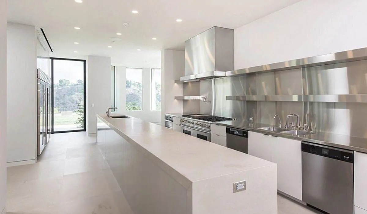 ترسم ملامح طراز الـ"ألترا مودرن" المطبخ الرحب، الذي يبدو خاليًا من الخزائن. فقد استُبدلت الرفوف المُعدَّة من خامة الـ"ألومينيوم" بها، وهي تنسجم مع المواد الكهربائيَّة المعدَّة من الـ"ستاينلس ستيل". وتتوسَّط المساحة "جزيرة" مستطيلة تمتدُّ على طول المطبخ ومعدَّة من الرخام.