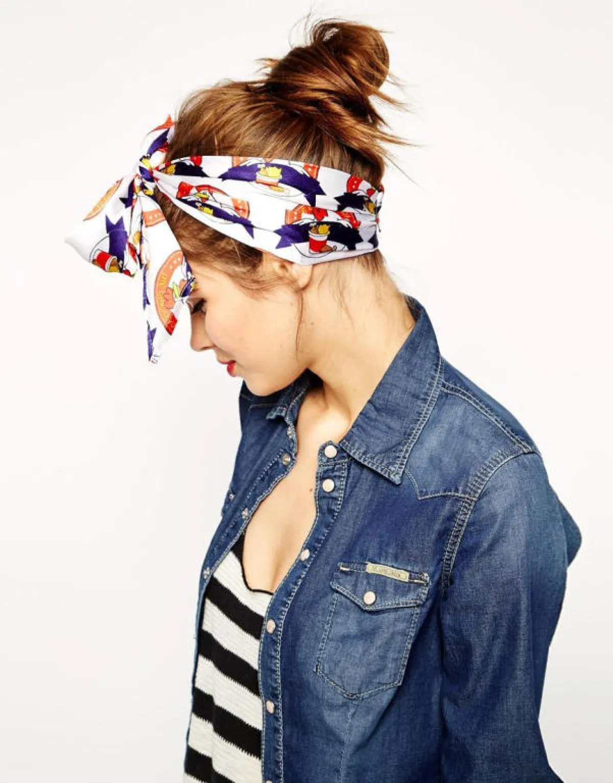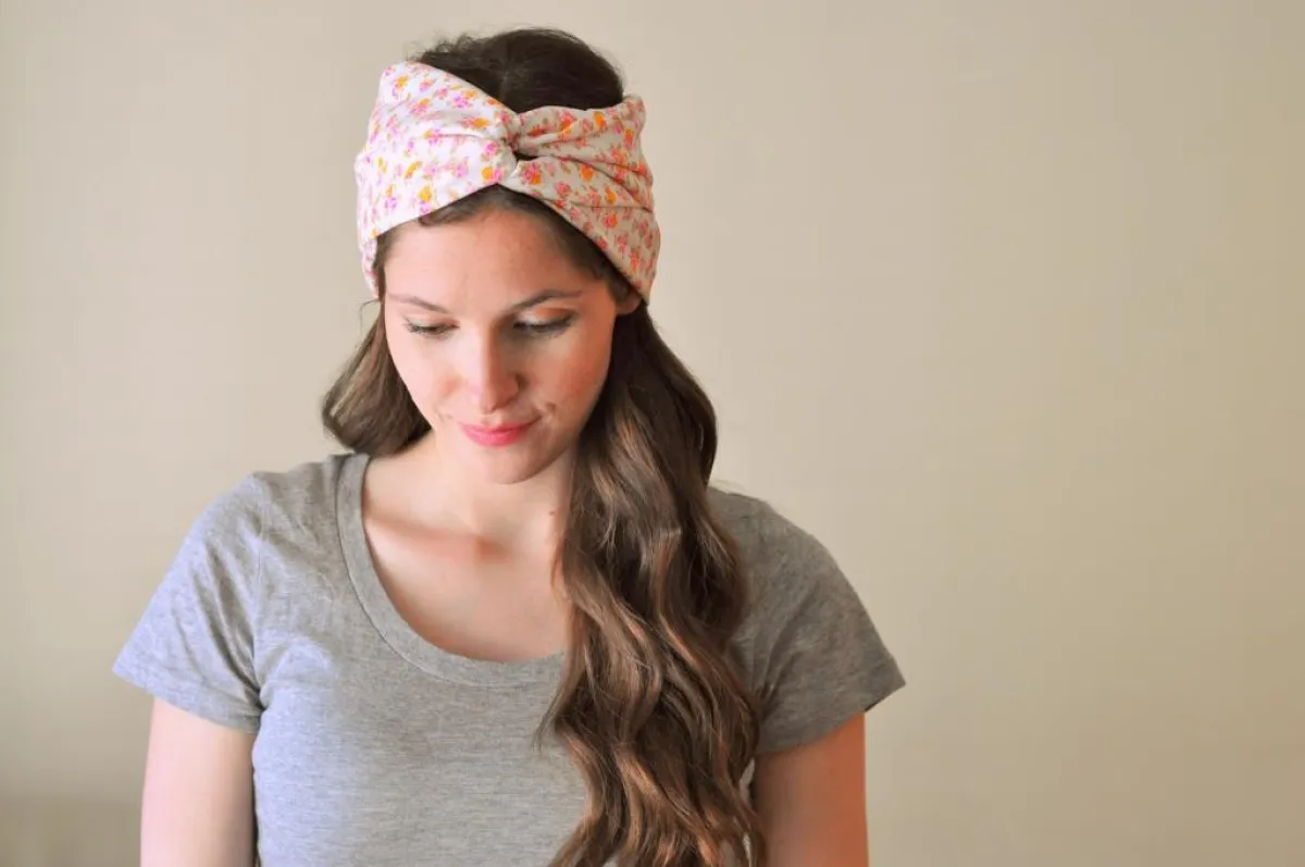 -ريترو تويست: تتطلب هذه التصفيفة وشاحًا طويلًا بنقشة ناعمة. سرّحي شعركِ على شكل ربطة ذيل الحصان. إطوي الوشاح ولفيه حول الربطة بشكل يكون أقصر من شعرك.