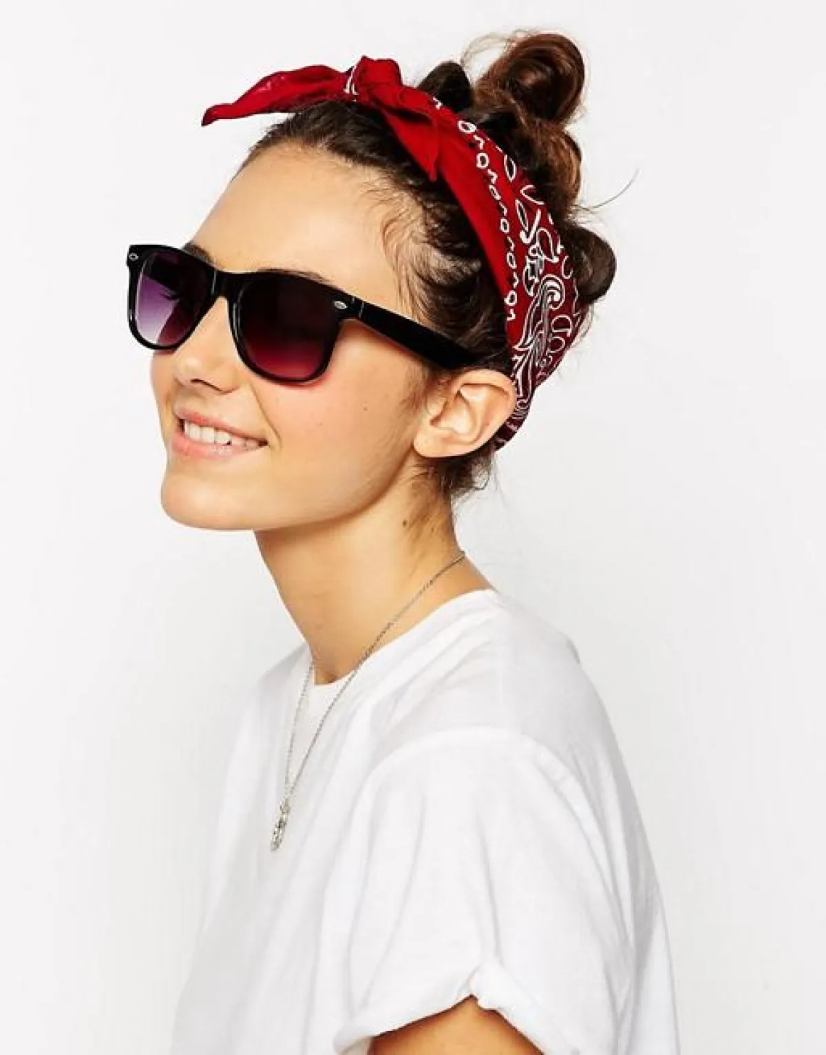 -الوشاح المزدوج: لمحبات الغرابة ارفعي شعركِ على شكل كعكة عالية، من ثم ضعي الوشاح حول رأسكِ واعقديه من الجهة الأمامية، ثم شكّلي عقدة ثانية من الخلف.