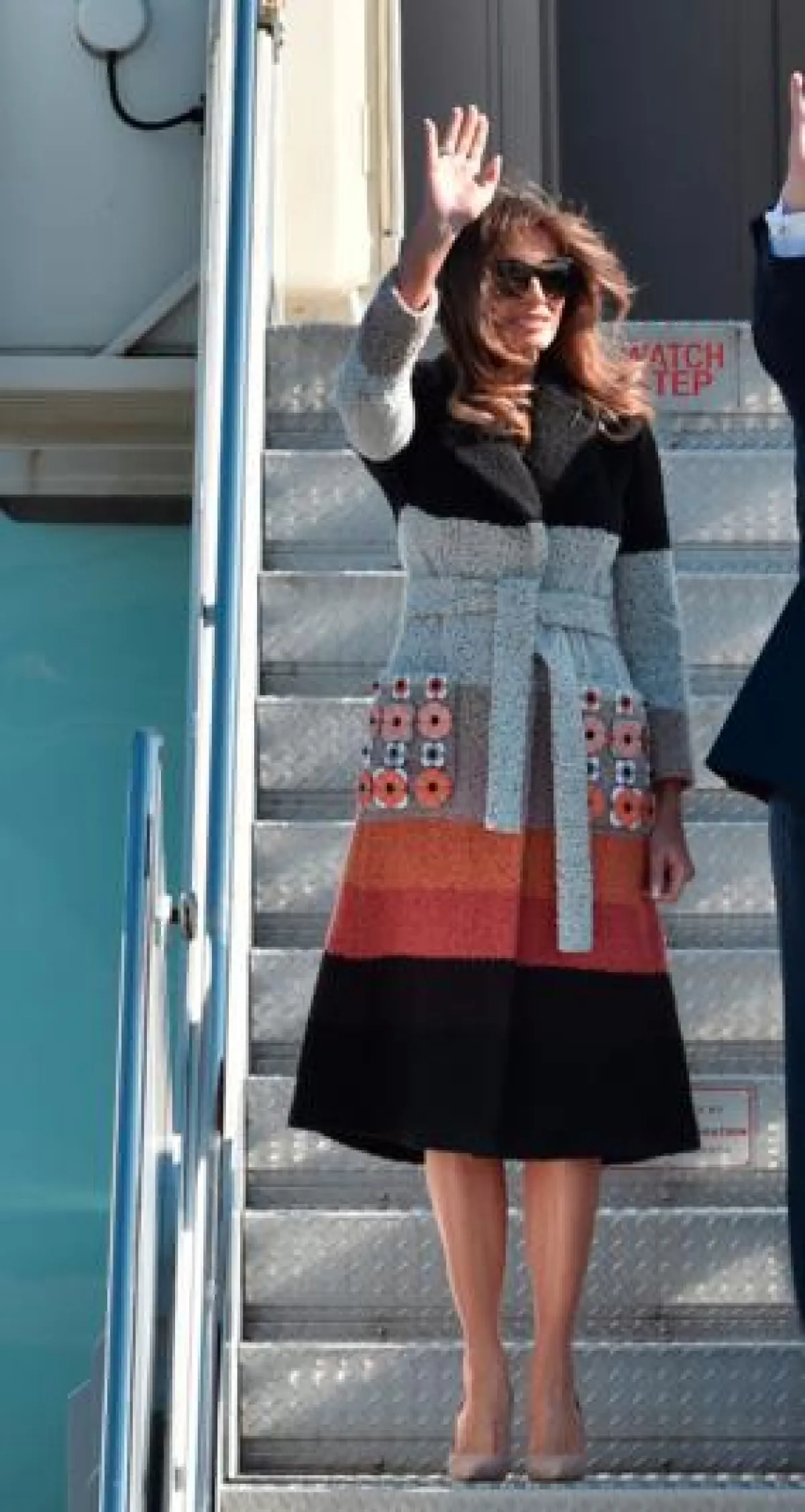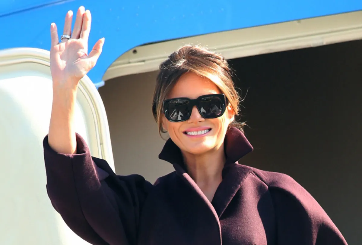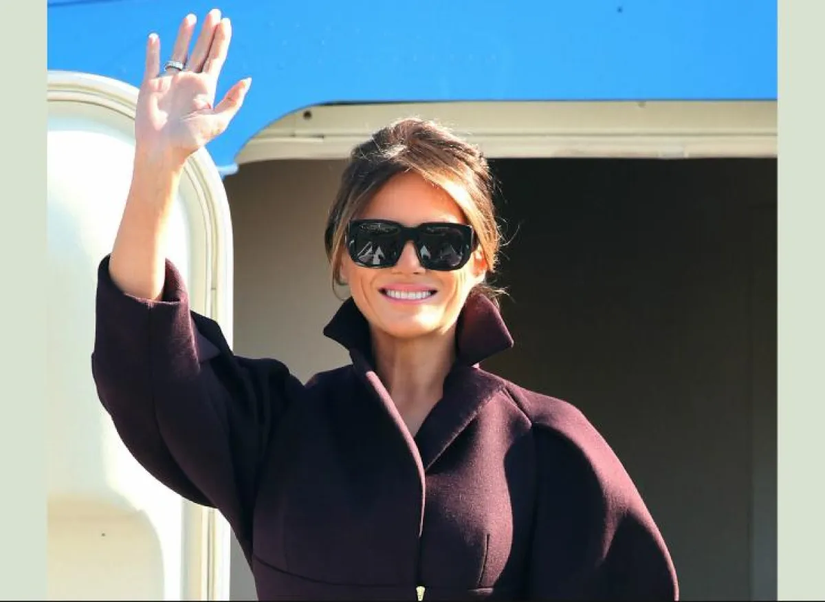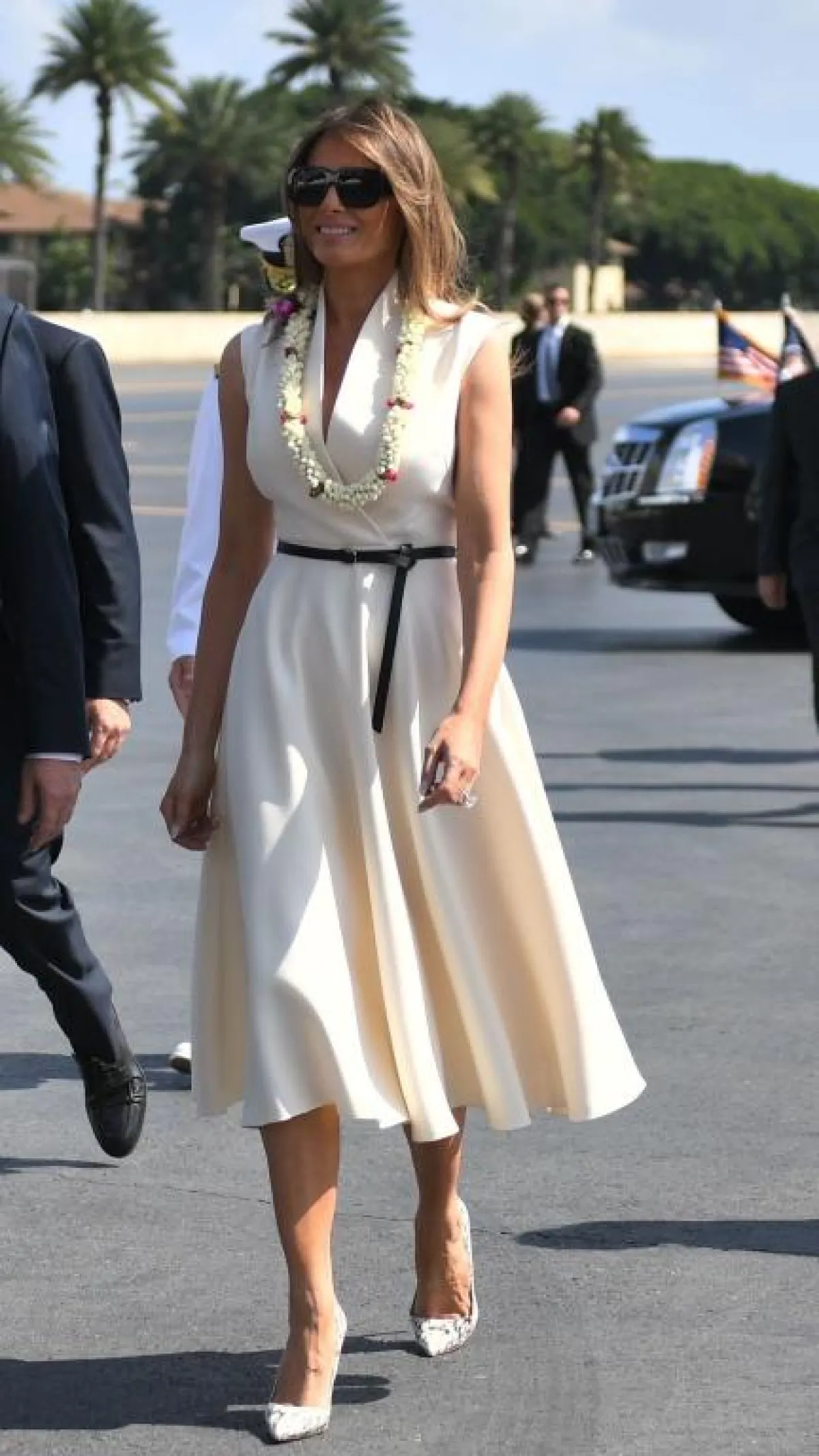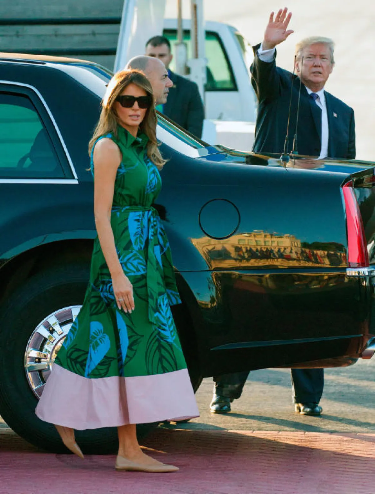 عند وصولها تألقت "ميلانيا" Melania باطلالة كاجوال عبارة عن فستان معرّق بالورود، بتكلفة 1090 دولارًا نسقته مع حذاء من دون كعب من "كريستيان لوبوتان" Christian Louboutin بسعر 595 دولارًا.