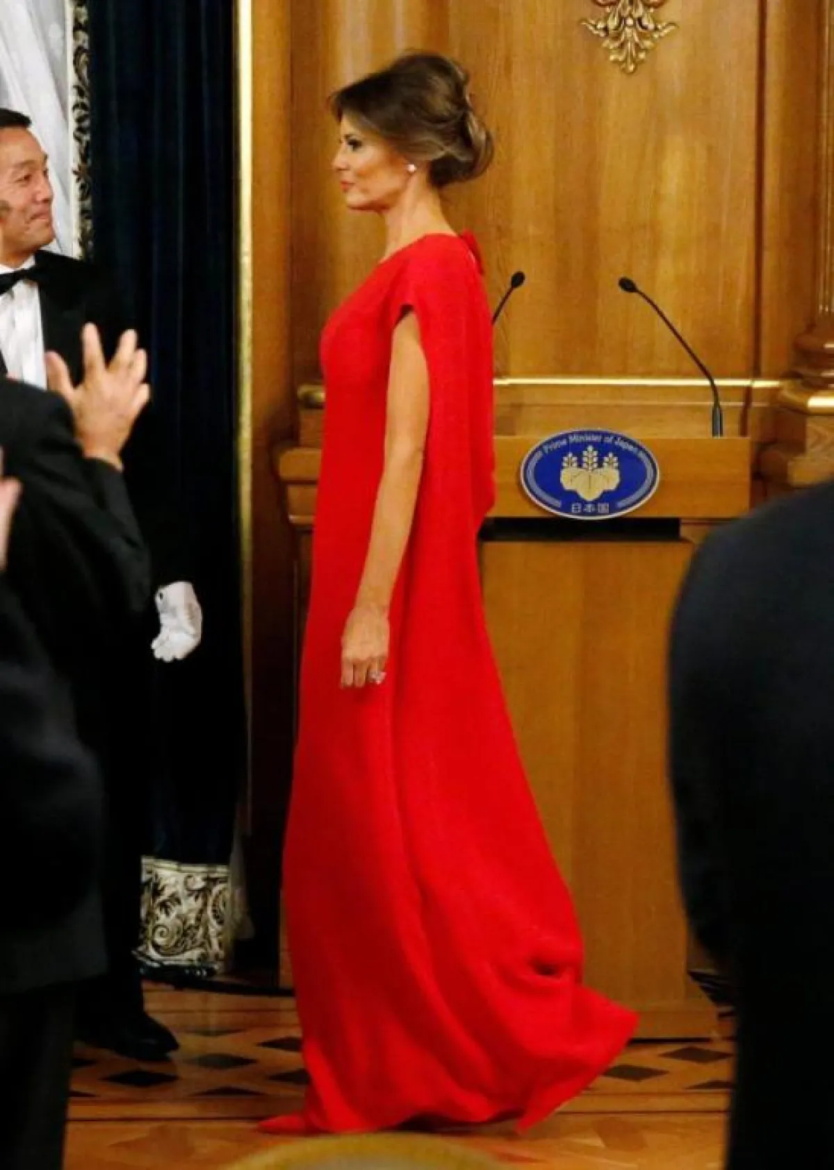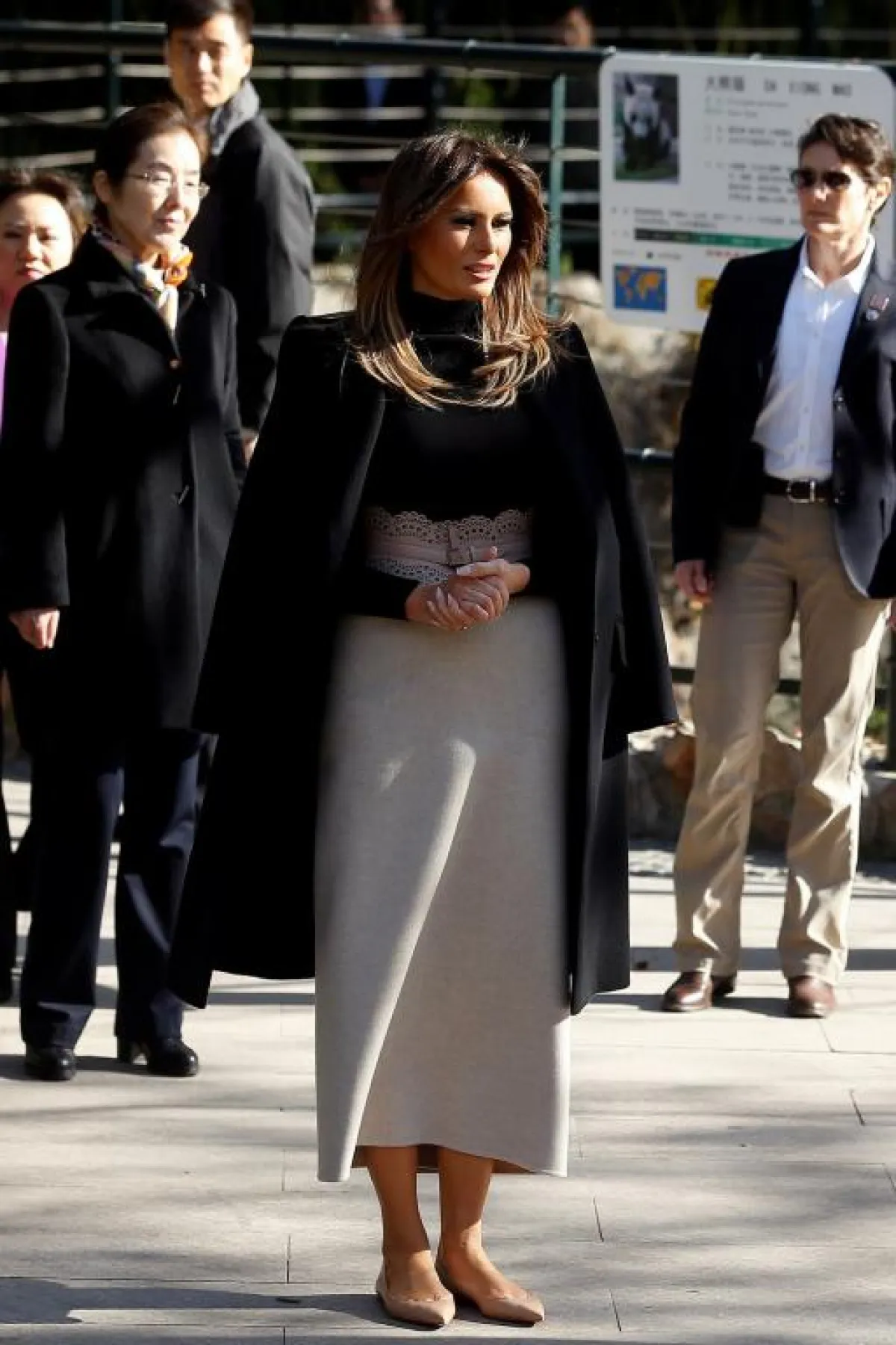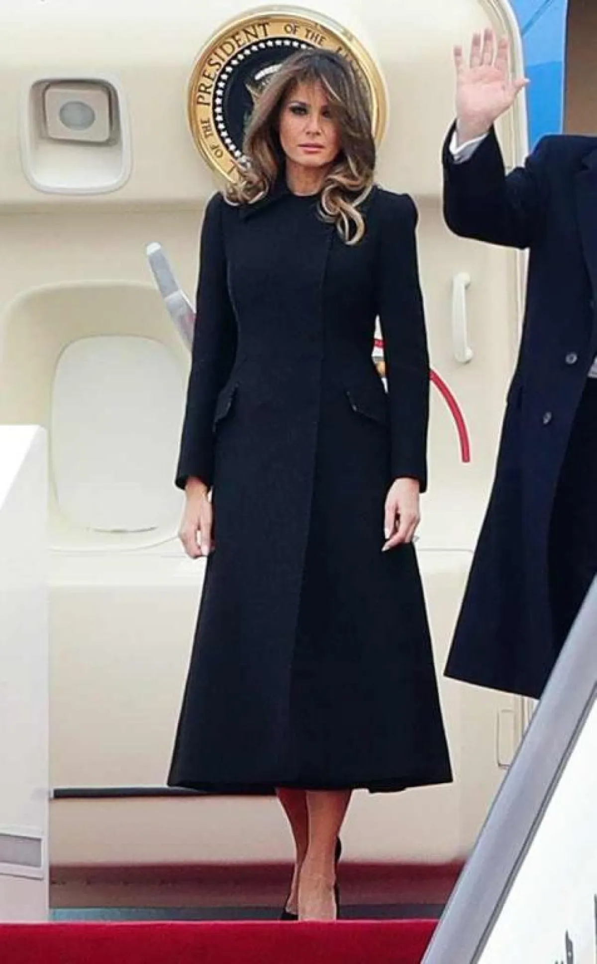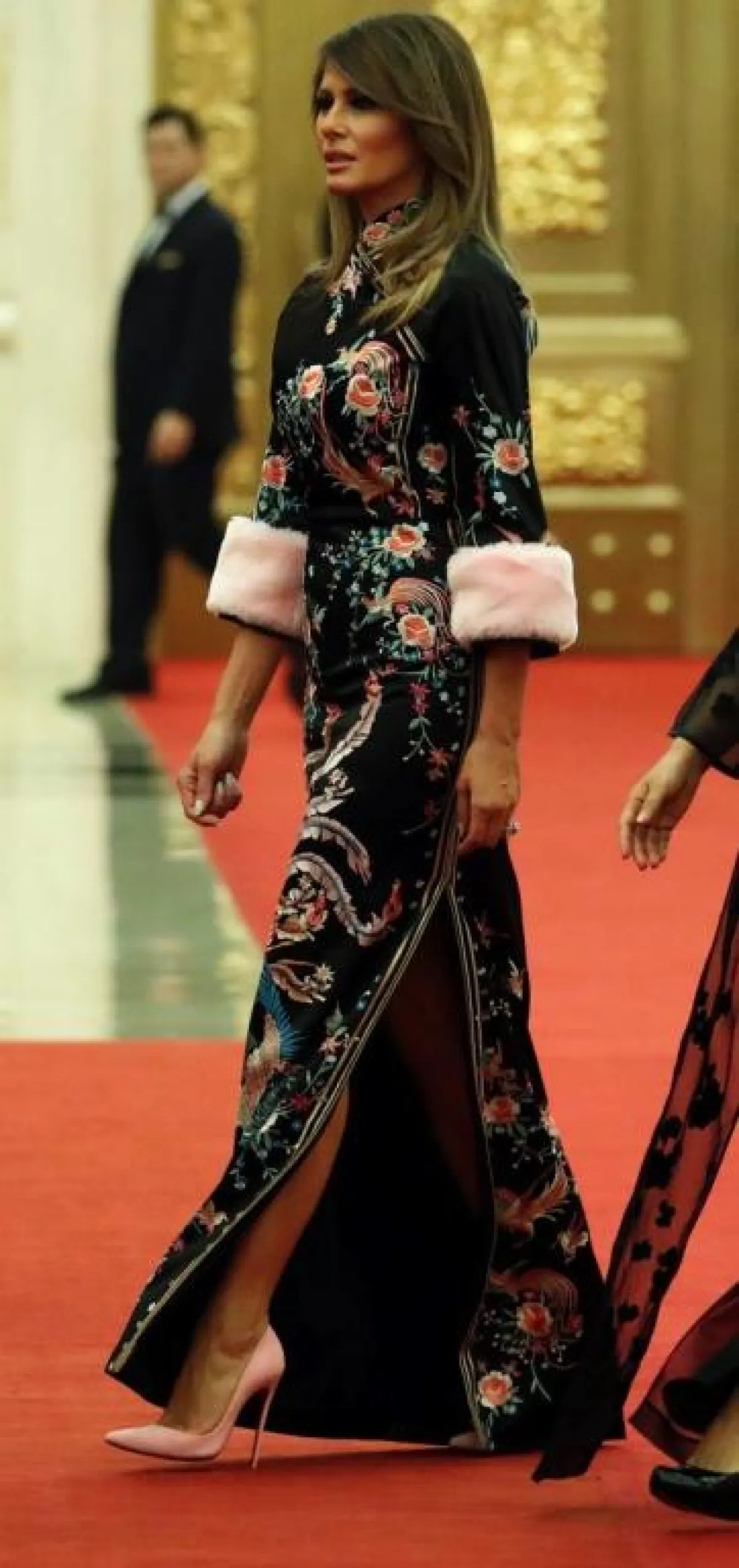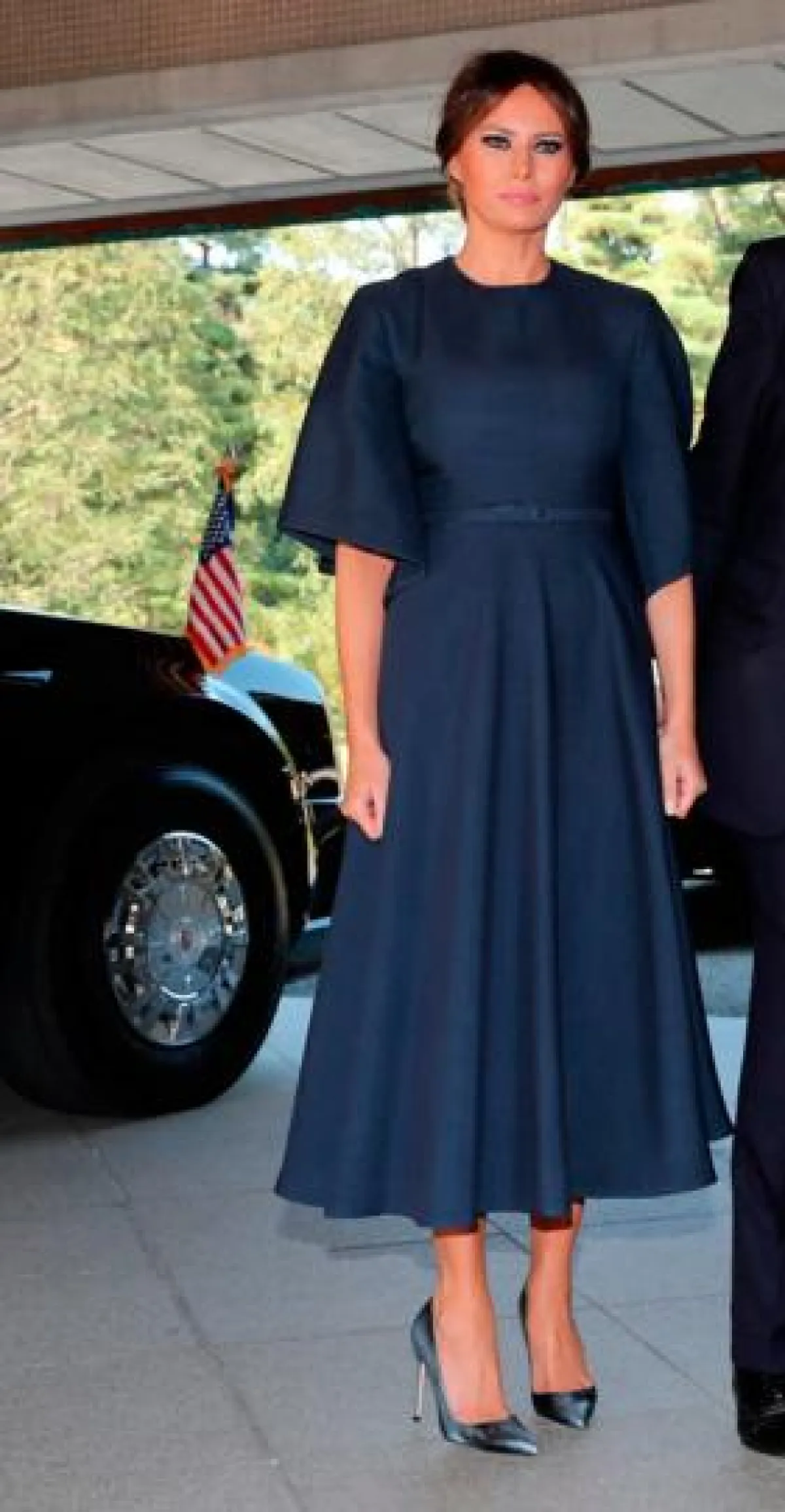 عند وصولها تألقت "ميلانيا" Melania باطلالة كاجوال عبارة عن فستان معرّق بالورود، بتكلفة 1090 دولارًا نسقته مع حذاء من دون كعب من "كريستيان لوبوتان" Christian Louboutin بسعر 595 دولارًا.