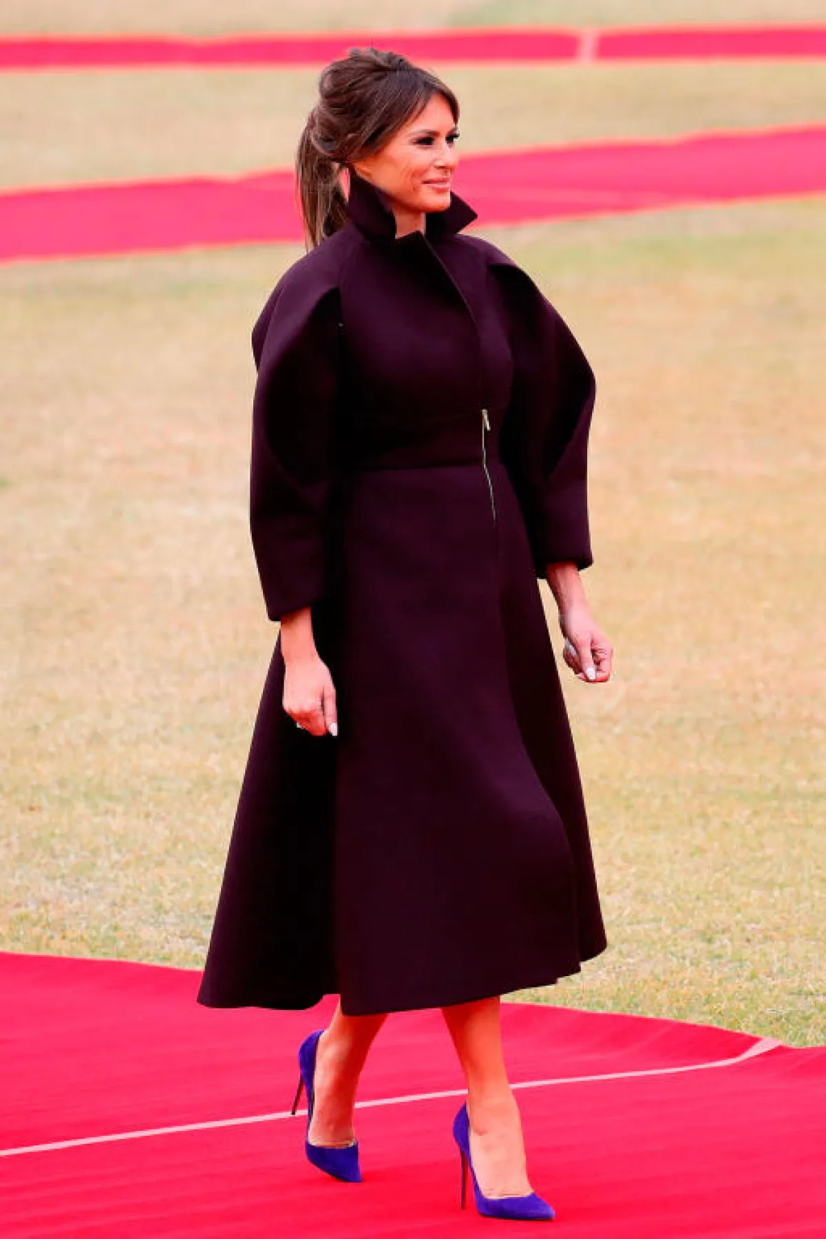 وبعدها شاهدناها بمعطف باللون الأزرق الحيوي، اختارته من دار "ايميليو بوتشي" Emilio Pucci بسعر 2100 دولار تقريبًا، ونسّقته مع حذاء باللون نفسه من "كريستيان لوبوتان" Christian Louboutin بسعر 600 دولار تقريبًا، وفي مناسبة أُخرى اختارت ميلانيا معطفًا من "فندي" بسعر 4500 دولار تقريبًا، مع حذاء من "مانولو بلانيك" Manolo Blahnik بسعر 700 دولار تقريبًا.