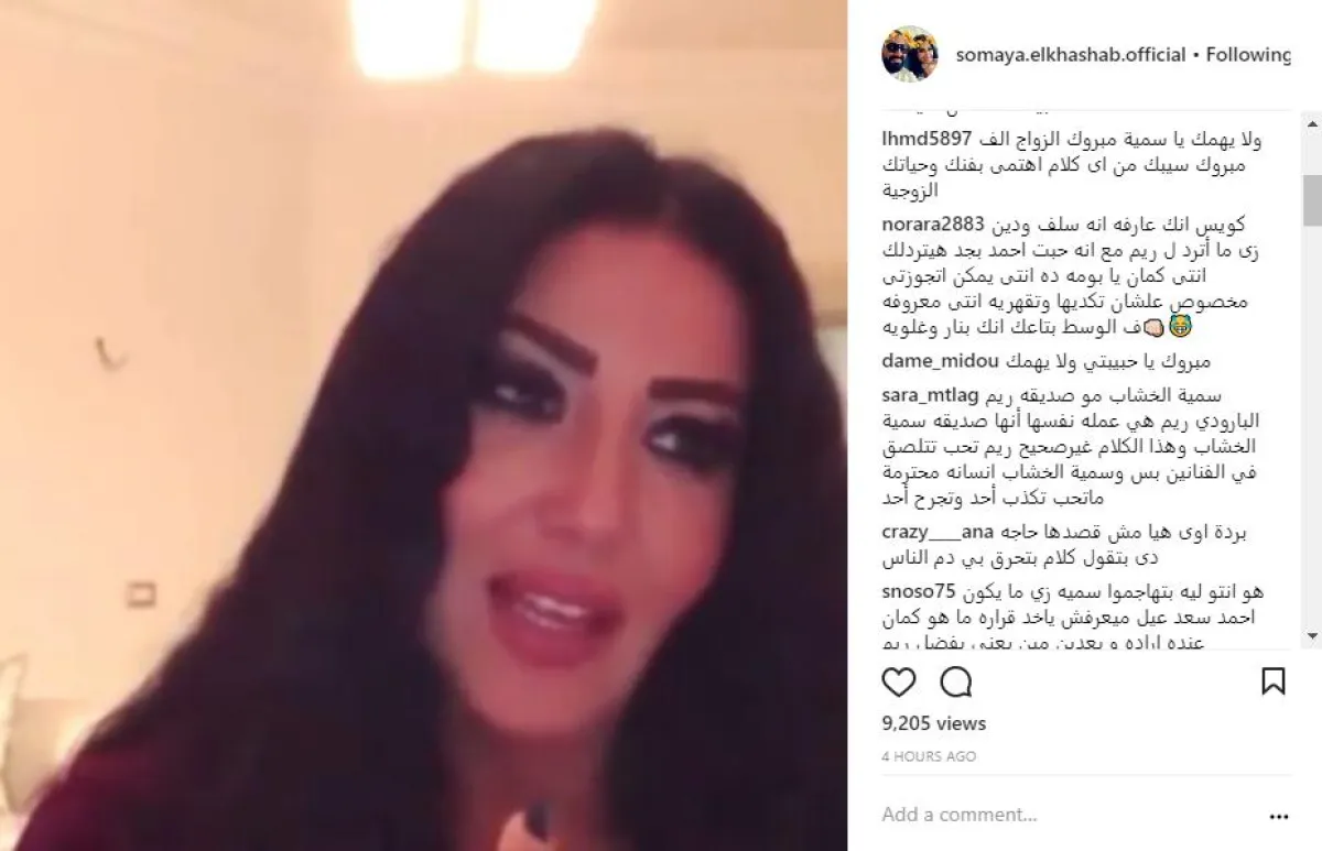 ونصحها معجب آخر بحذف الفيديو فورا تجنبا للسخرية منها، ولكن سبق السيف العذل، فقد بدأت الحفلة على سمية الخشاب دون توقف، عدا بعض التعليقات التي تدعمها وتؤكد أنها ليست صديقة لريم البارودي ولم تخطف منها أحمد سعد، وتزوجت "في الحلال" وتمنت لها التوفيق.