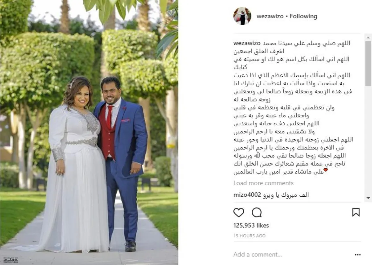 وعلقت ويزو على الصور قائلة: "اللهم صلي وسلم على سيدنا محمد أشرف الخلق أجمعين، اللهم اني أسألك بكل اسم هو لك او سميته في كتابك ، اللهم إني أسألك باسمك الأعظم الذي أذا دعيت به استجبت وإذا سألت به أعطيت ان تبارك لنا في هده الزيجة وتجعله زوجا صالحا لي وتجعلني زوجه صالحه له، وان تعظمني في قلبه وتعظمه في قلبي، واجعلني ماء عينه وقر به عيني، اللهم اجعلني دفء حياته وأسعدني، ولا تشقيني معه يا ارحم الراحمين".