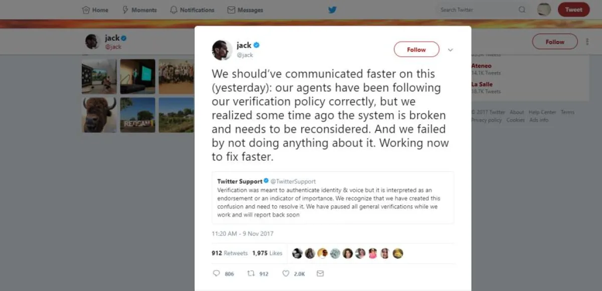 وغرد الرئيس التنفيذي للموقع جاك دورسي: كان ينبغي علينا أن نتحدث عن ذلك في وقت سابق أمس، وقد اتبع الموقع سياسة تدقيق جديدة، ولكننا أدركنا فشلها، فهي مازالت تحتاج إلى تنقيح، ولقد ارتكبنا خطأ بعدم التحرك السريع، لذلك نعمل الآن على إصلاح الأمر في أقرب وقت ممكن.