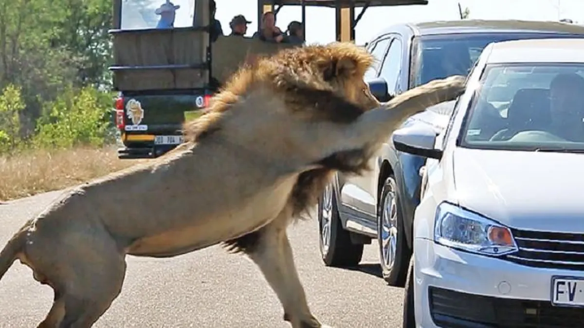 هاجم أسد ضخم سيارة سياح في محمية "كروغر" الطبيعية بجنوب إفريقيا بشكل مخيف وغير متوقع وبصورة أثارت الرعب والهلع بين السياح.