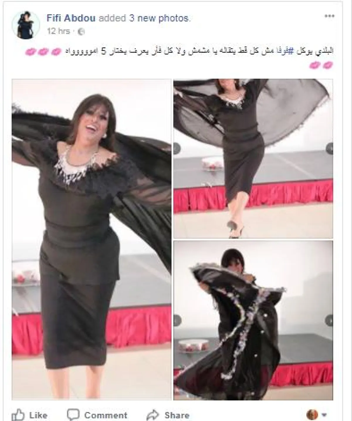 فيفي نشرت الصور الجديدة عبر حسابها بموقع الفيس بوك، وارتدت فستانًا باللون الأسود أقرب للجلاليب الشعبية، وأضافت "ملاية لف" مزودة ببعض الاكسسوارات، وعلقت على الصور قائلة: "البلدي يوكل فوفا مش كل قط يتقاله يا مشمش ولا كل فار يعرف يختار 5 امووووواه ".