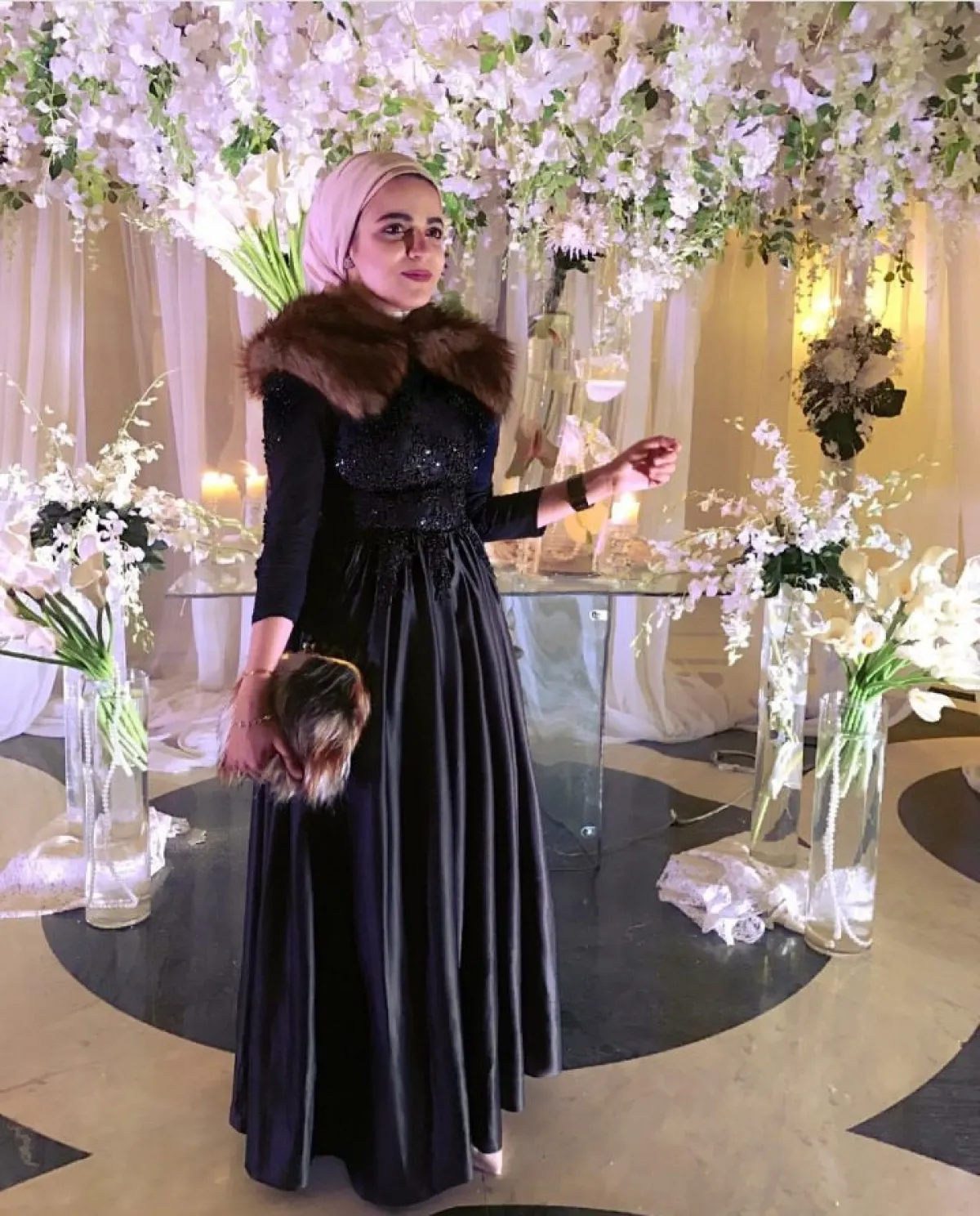 ومن الاطلالات التي ميّزت الفاشينيستا سحر، فستان مصمم بأناقة عالية يناسب السهرة وعليه فرو باللون البني.