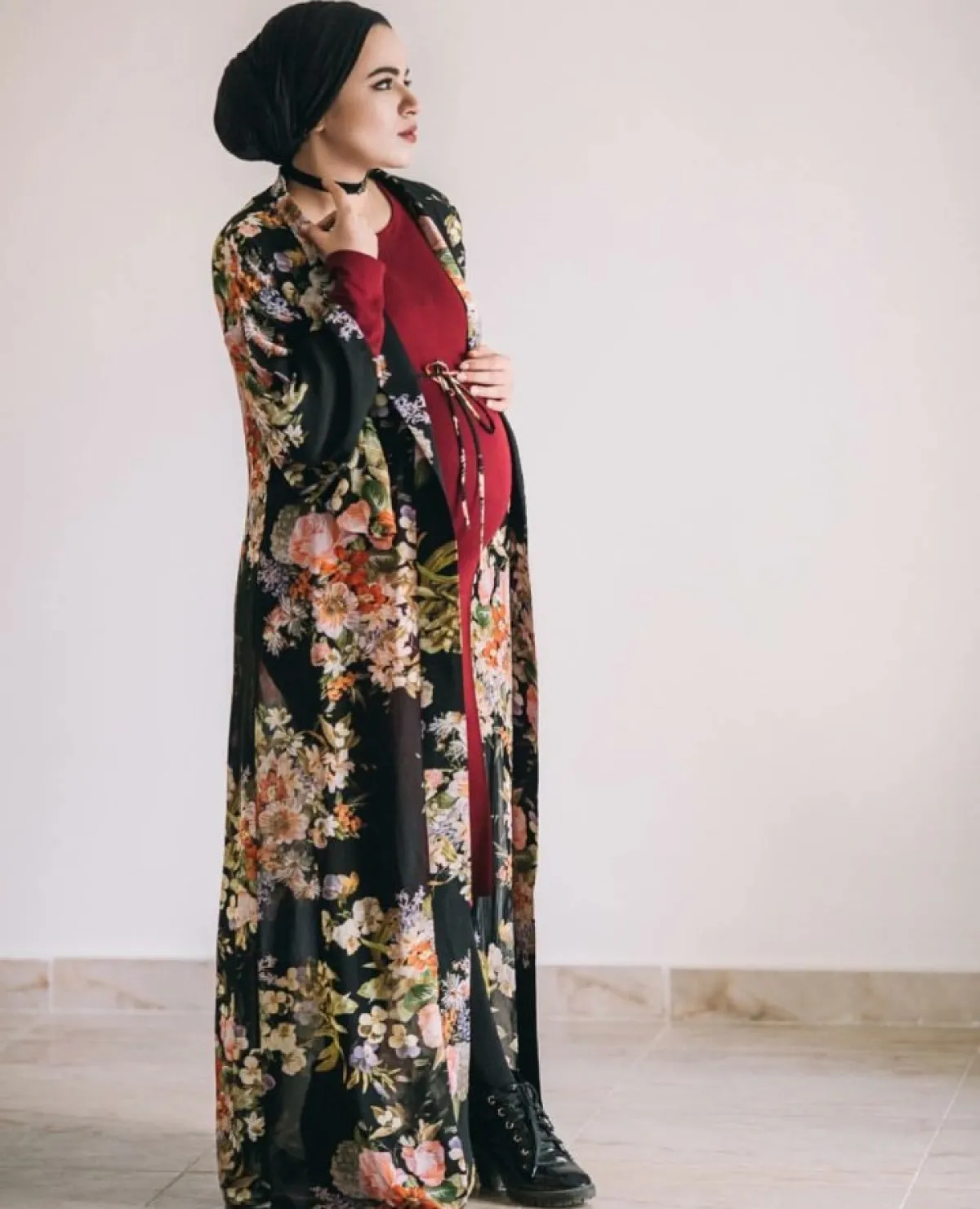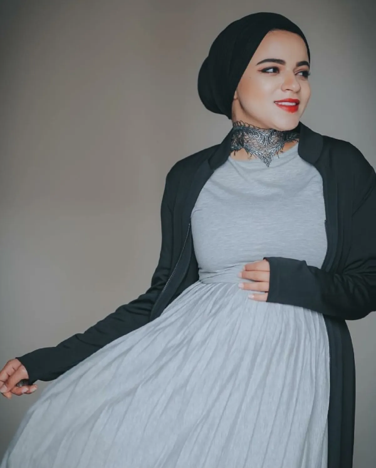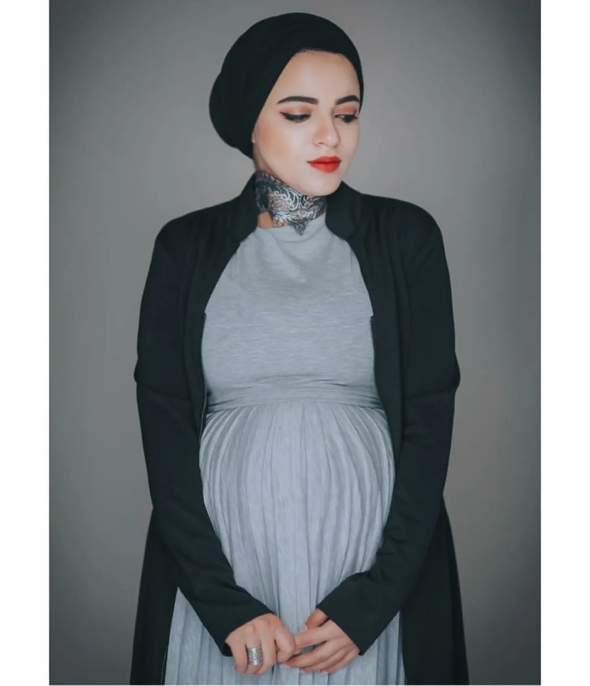 كذلك من الاطلالات المريحة لسحر خلال فترة الحمل، الفستان الأحمر مع الجاكيت الناعمة الموردة، أو الفستان الرمادي مع الجاكيت السوداء والحجاب المنسّق بلونه الأسود مع الاطلالة.