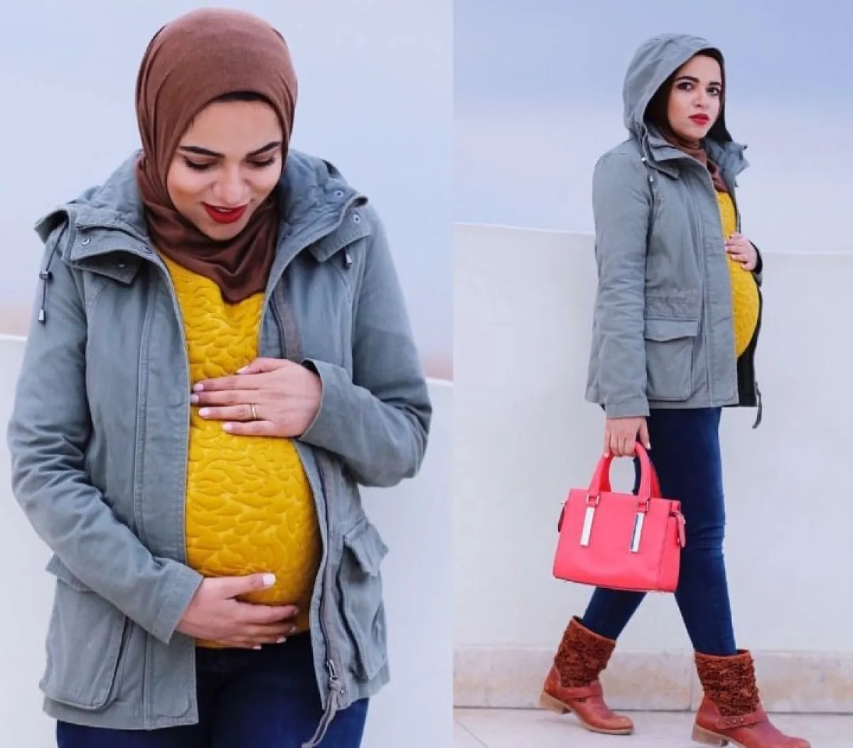 ومن بين اطلالاتها الناعمة خلال فترة الحمل، اختارت سحر فؤاد الجاكيت الرمادية مع القبعة لفصل الشتاء، مع الكنزة الشتوية باللون الأصفر ولفة الحجاب البنيّ اللون.