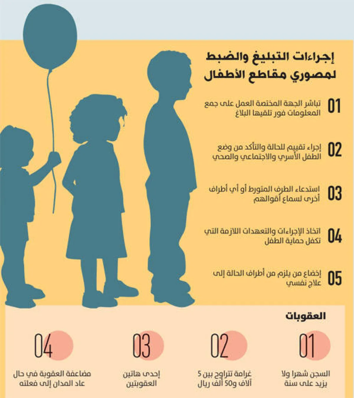 أوضح رئيس جمعية حقوق الإنسان أنه يحق للطفل أو الجهات الأخرى التقدم بشكوى ضد مصور المقطع، وفي حال الإدانة تكون العقوبة تعزيرية حسب الإجراء النظامي، وأضاف: خلال ذلك يستدعى ولي أمر الطفل ويؤخذ عليه تعهد بالمحافظة عليه، وعند تكرار ذلك، يحق لناظر القضية اتخاذ إجراءات أخرى كنقل الحضانة من ولي الأمر إذا كانت والدته مطلقة، أو إيداع الطفل في الحماية الاجتماعية.