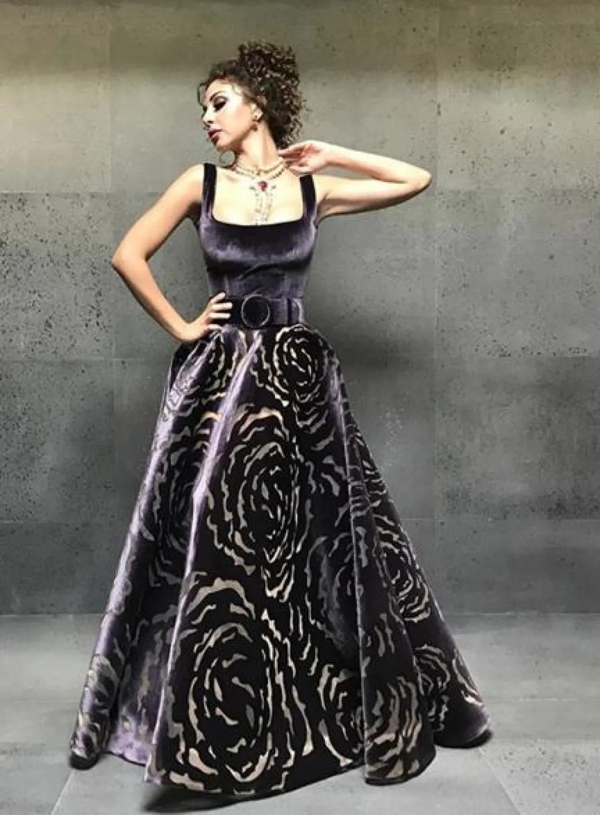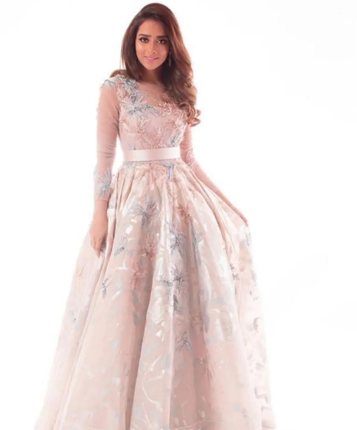 زينت بلقيس فتحي اطلالتها بفستان السهرة بحزام على الخصر