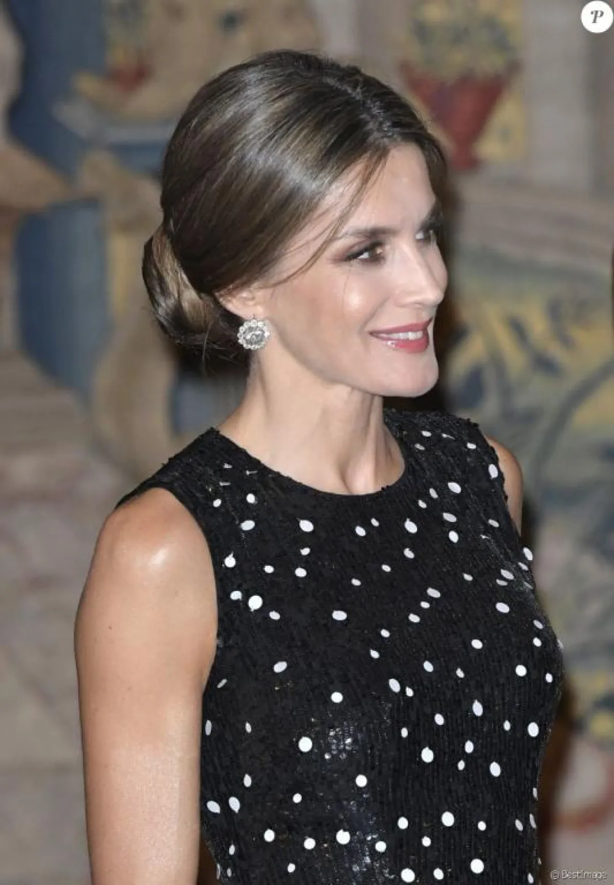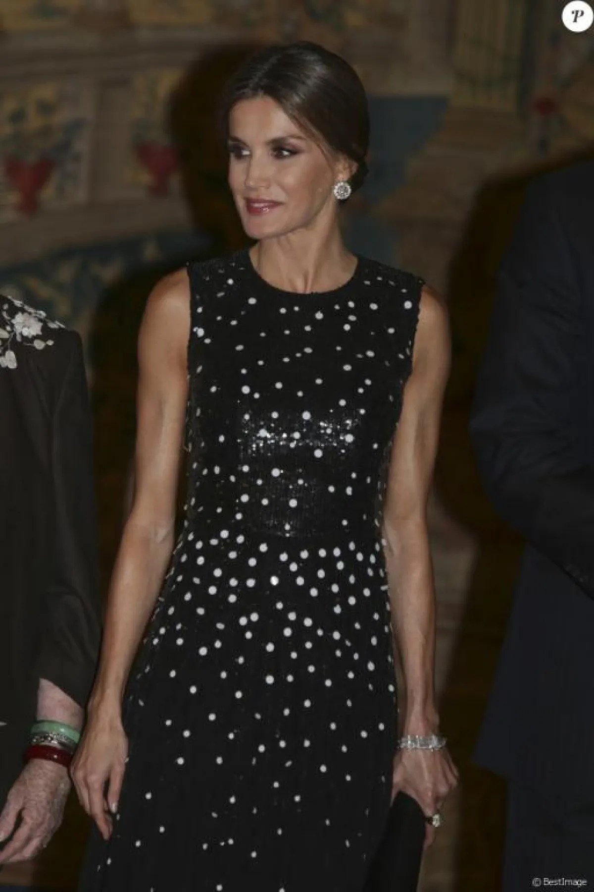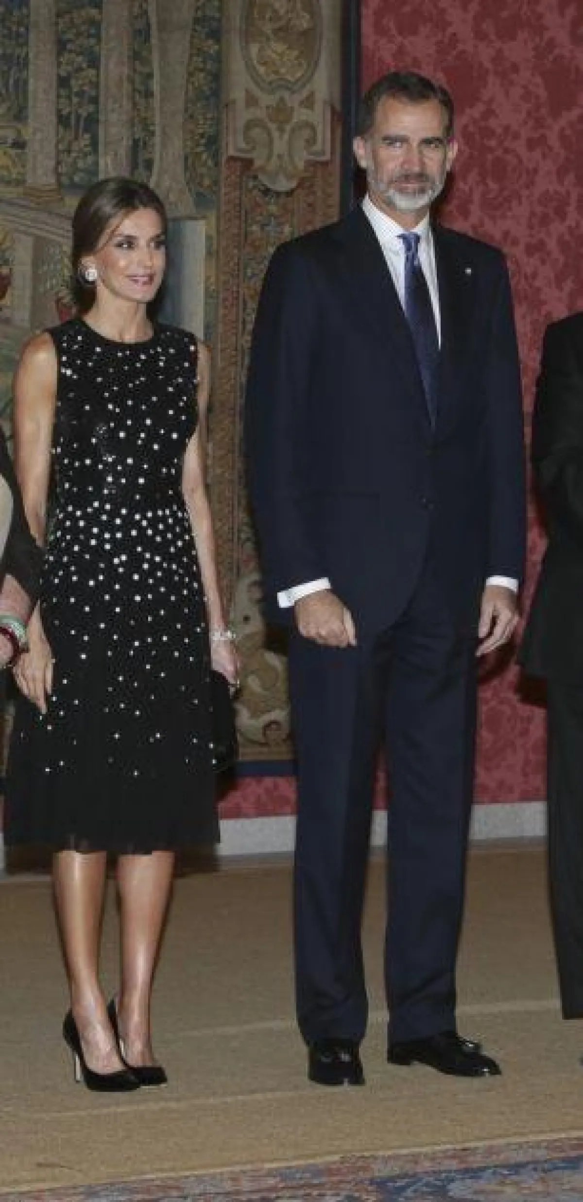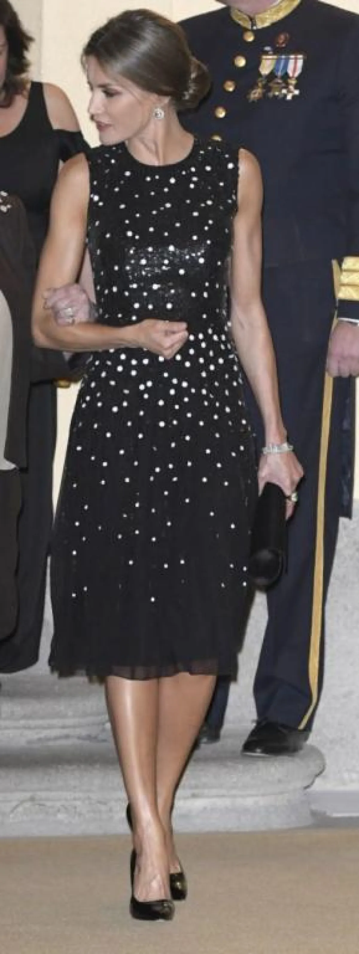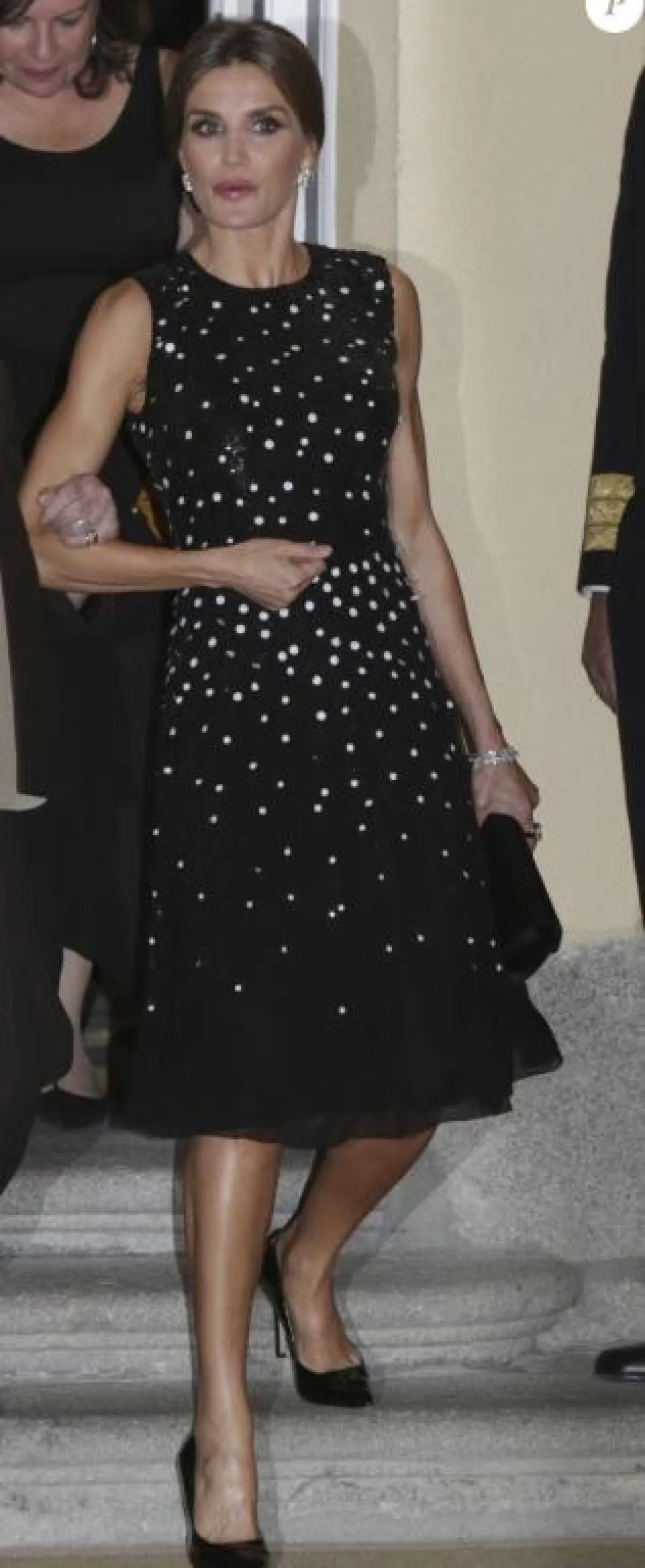 تألقت الملكة ليتيسيا أورتيز زوجة ملك إسبانيا فيليبي السادس في أخر ظهور لها بإطلالة مميزة حيث لفتت الأنظار بأناقتها الراقية و مكياجها وكذلك تسريحة شعرها ، ارتدت فستان أسود اللون متوسط الطول من تصميم دار كارولينا هيريرا Carolina Herrera بتكلفة 5000 يورو ، صنع من قماش طرز بأكمله بالترتر الأسود تخللته بحبات من الترتر فضية اللون ذات الحجم الكبير أظفت على الفستان بريقا مميزا وقد نسقته بحذاء اسكاربان أسود اللون و حقيبة يد صغيرة من دار فيليبي فارلا Felipe Varela الاسبانية وقد جاءت إطلالتها في غاية الأناقة التي عودتنا عليها الملكة ليتيسيا منذ زواجها بالأمير فيليبي السادس الذي أصبح ملكا لإسبانيا سنة 2014 .