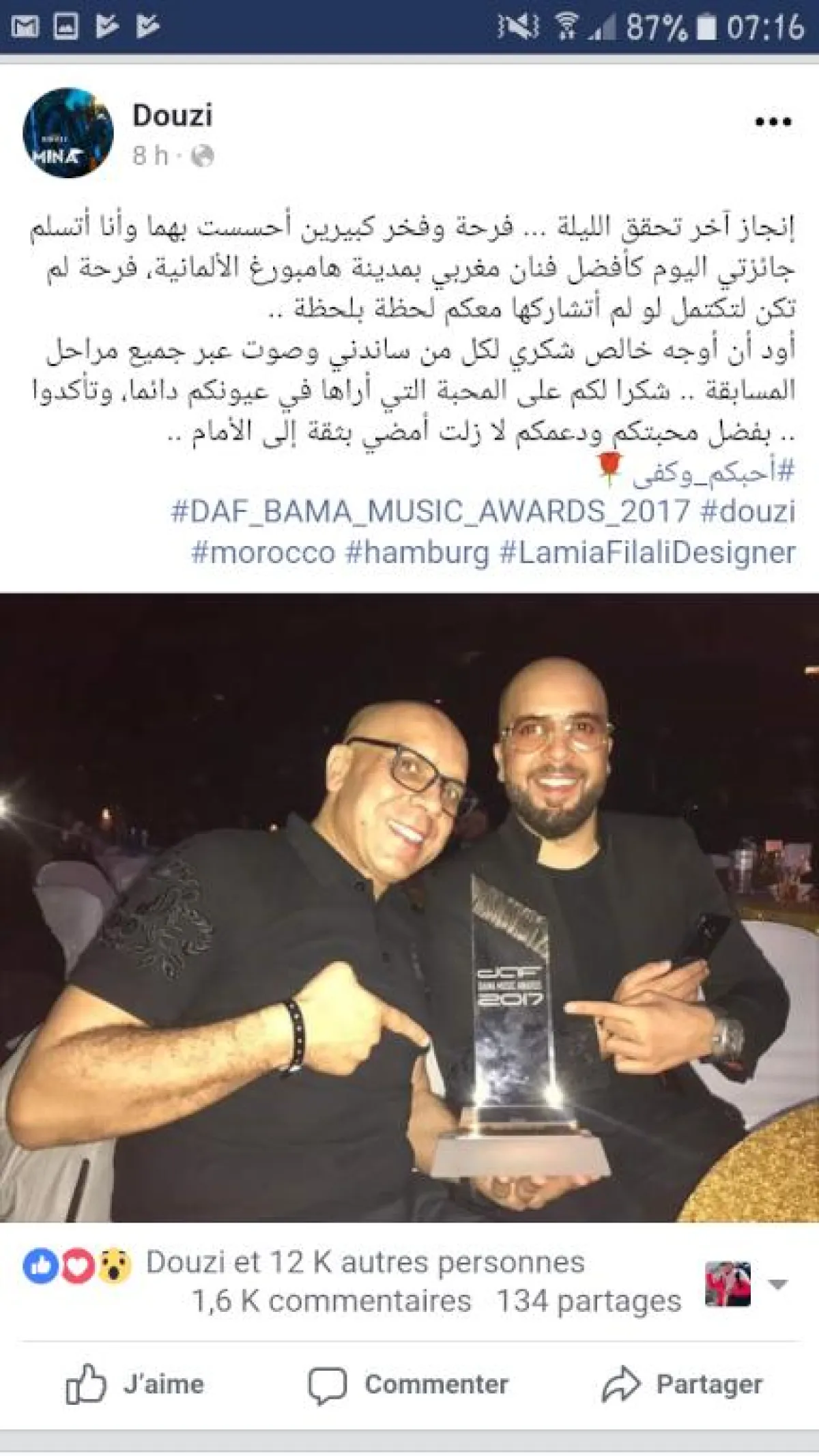 وكتب الدوزي تدوينة على حسابه الشخصي بموقع التواصل الاجتماعي انستقرام، عبر من خلالها عن شكره لجمهوره الذي سانده ومنحه صوته في مرحلة التصويت، مضيفا بالقول " إنجاز آخر تحقق الليلة ... فرحة وفخر كبيرين أحسست بهما وأنا أتسلم جائزتي اليوم كأفضل فنان مغربي بمدينة هامبورغ الألمانية، فرحة لم تكن لتكتمل لو لم أتشاركها معكم لحظة بلحظة ".