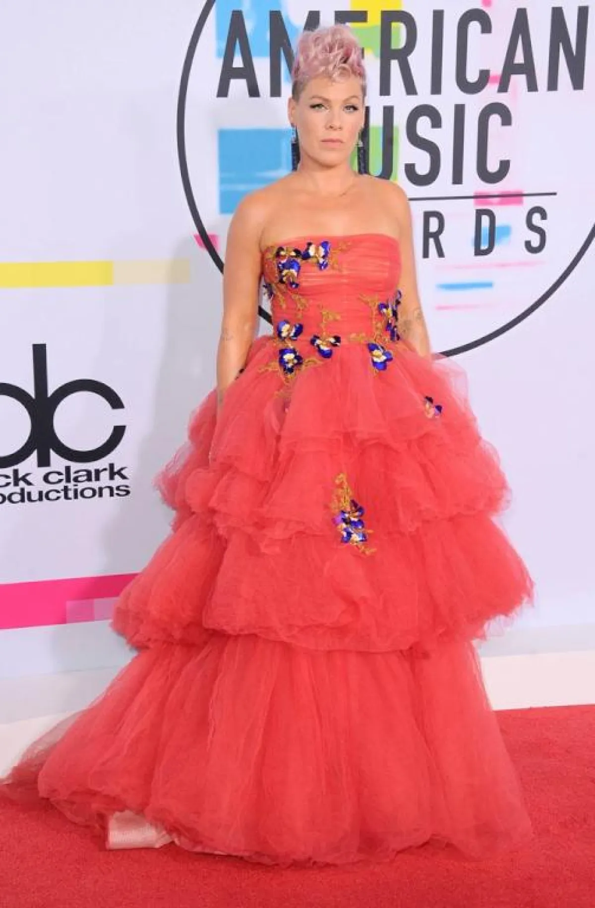 المغنية بينك Pink التي لطالما عُرفت بجرأتها في اختيار الملابس، فضّلت أن تطلّ علينا من خلال هذا الحفل بإطلالة أميرة من عالم الأطفال، من خلال فستان زهري من تصميم مونيك لويلييه Monique Lhuillier.