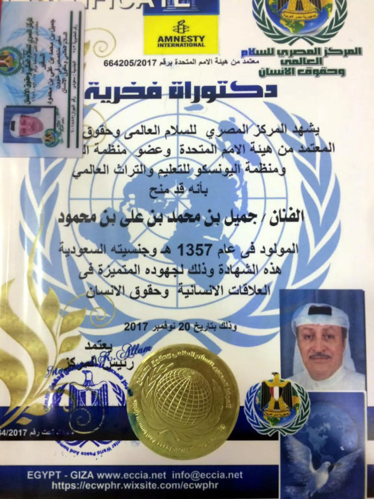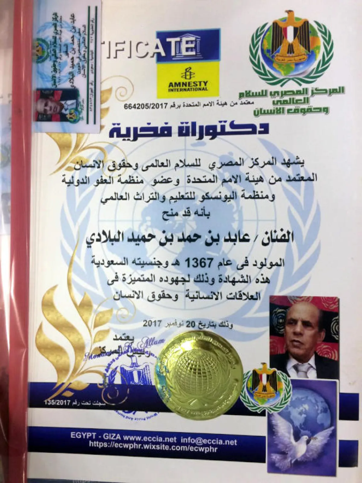 منحت منظمة الأمم المتحدة والمركز المصري للسلام العالمي وحقوق الإنسان درجة الدكتوراه الفخرية لثلاثة من الفنانين السعوديين، وهم الموسيقار جميل محمود والفنان الشعبي عابد البلادي والملحن سامي الخليفة، وذلك نظير ما قدموه من أعمال غنائية تجاوزت حدود الإقليمية إلى الوطن العربي، وأسعدوا بأعمالهم الجماهير العربية. كما تمّ تعيينهم سفراء للسلام العالمي وحقوق الإنسان نظير جهودهم المتميزة في العلاقات الإنسانية وحقوق الإنسان، في حفل التكريم الذي أقيم لهم في القاهرة، وقام رئيس المركز الدكتور محمد علام بتسليمهم شهادة الدكتوراه الفخرية بحضور شخصيات بارزة من العالم العربي، وتغطية إعلامية لعدد كبير من القنوات والصحافة العالمية.