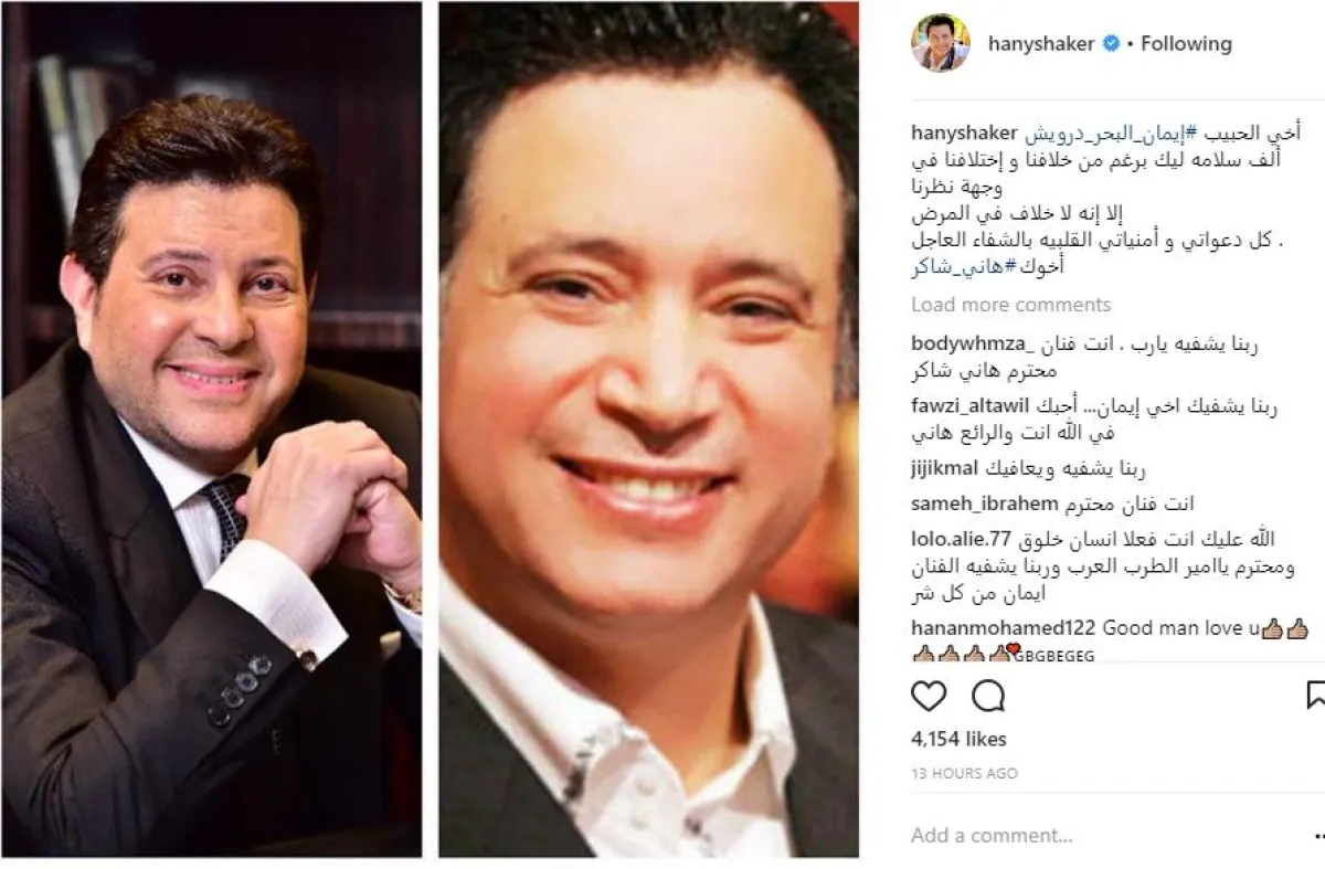تجاوز نقيب الموسيقيين هاني شاكر الخلافات القضائية المشتعلة بينه وبين المطرب ايمان البحر درويش، كما تجاهل التلميحات بأنه السبب في إصابة الأخير بارتفاع في ضغط الدم أدى إلى نزيف في المخ، ووجه له برقية محبة تمنى فيها الشفاء العاجل لدرويش مؤكداً أنه "لا خلاف في المرض".