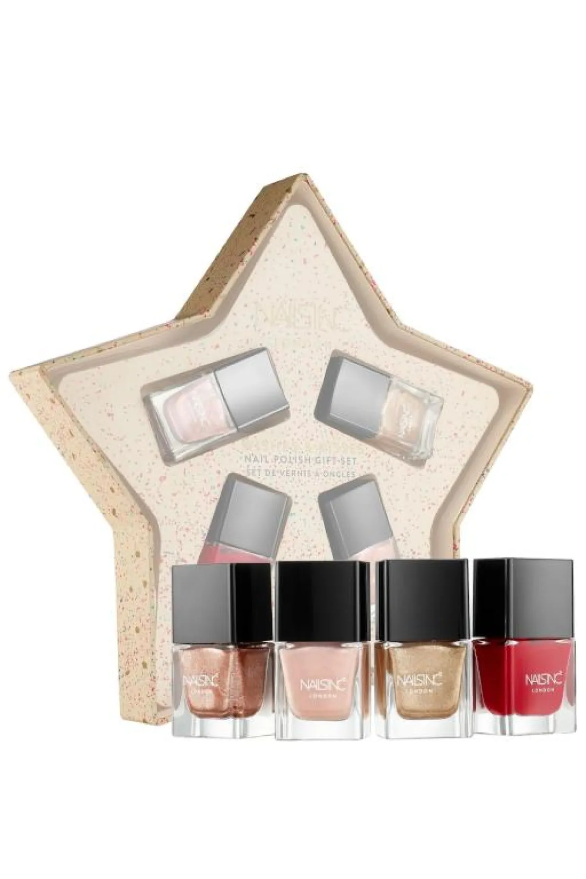 8. NAILS INC. Wishing On A Star Nail Polish Gift Set: هذه المجموعة من المناكير مكونة من أربعة ألوان لامعة ومميزة وأنيقة، وهي مثالية لعاشقات موضة طلاء الأظافر، كما أنها مزيج من الوميض والبريق اللامع. تتألف من الألوان التالية: الأحمر الداكن، البرونزي، الزهري، والمرجان الوردي.