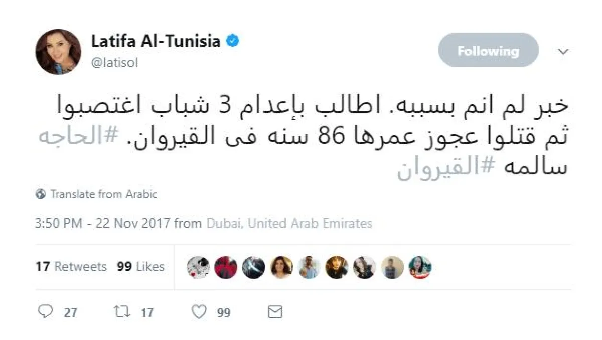 لطيفة أطلقت تغريدة عبر حسابها الموثق بموقع تويتر قالت فيها: خبر لم انم بسببه. اطالب بإعدام 3 شباب اغتصبوا ثم قتلوا عجوز عمرها 86 سنه فى القيروان. ثم تضامنت مع هاشتاق#الحاجه سالمه و #القيروان.