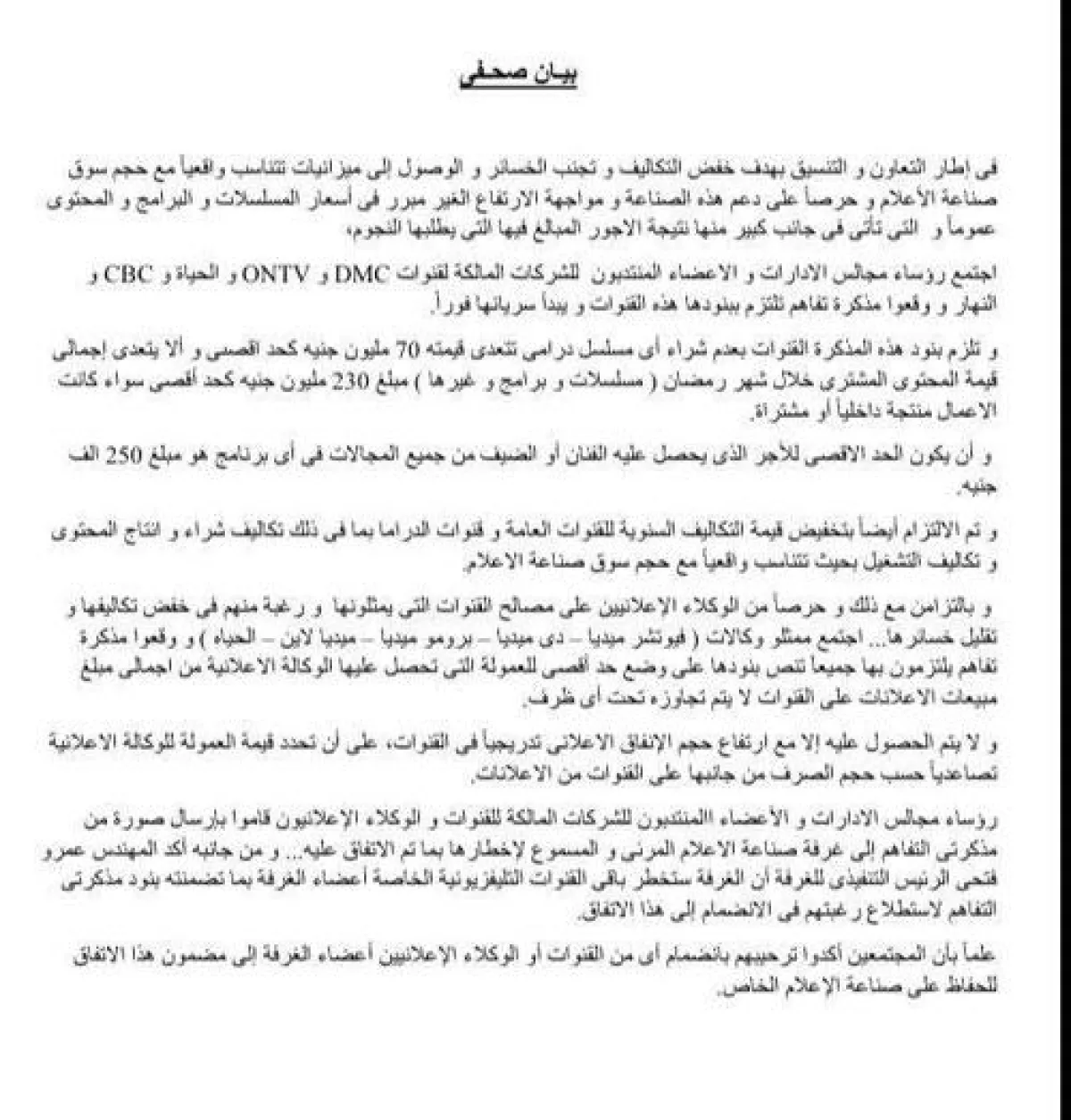 ووقّع رؤساء القنوات الفضائية على مذكرة تفاهم خاصة بتحديد حد أقصى لأسعار المسلسلات وأجور النجوم وتخفيض قيمة التكاليف السنوية للقنوات العامة والدراما، مؤكدين التزام جميع الموقعين ببنود مذكرة التفاهم التي يبدأ سريانها فورا، ومخاطبين باقي القنوات الخاصة من خلال غرفة صناعة الإعلام بالانضمام إلى الاتفاق.