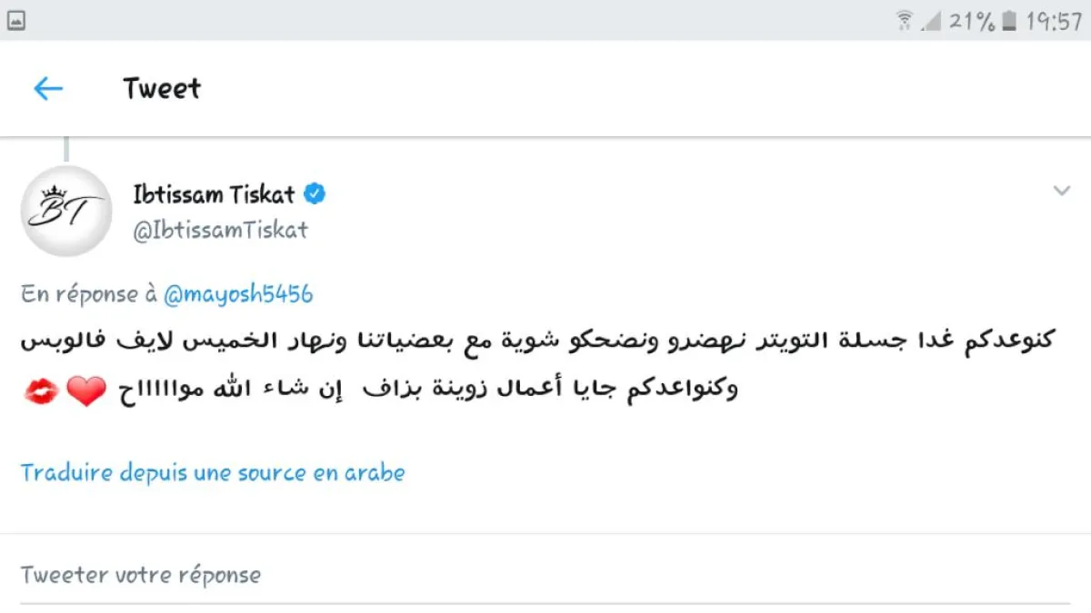 وتفاعل العديد من متابعي الفنانة ابتسام تسكت مع التغريدة، حيث عبّر العديد منهم عن حبهم لها، وما غضبهم منها إلّا لمحبتهم لها.