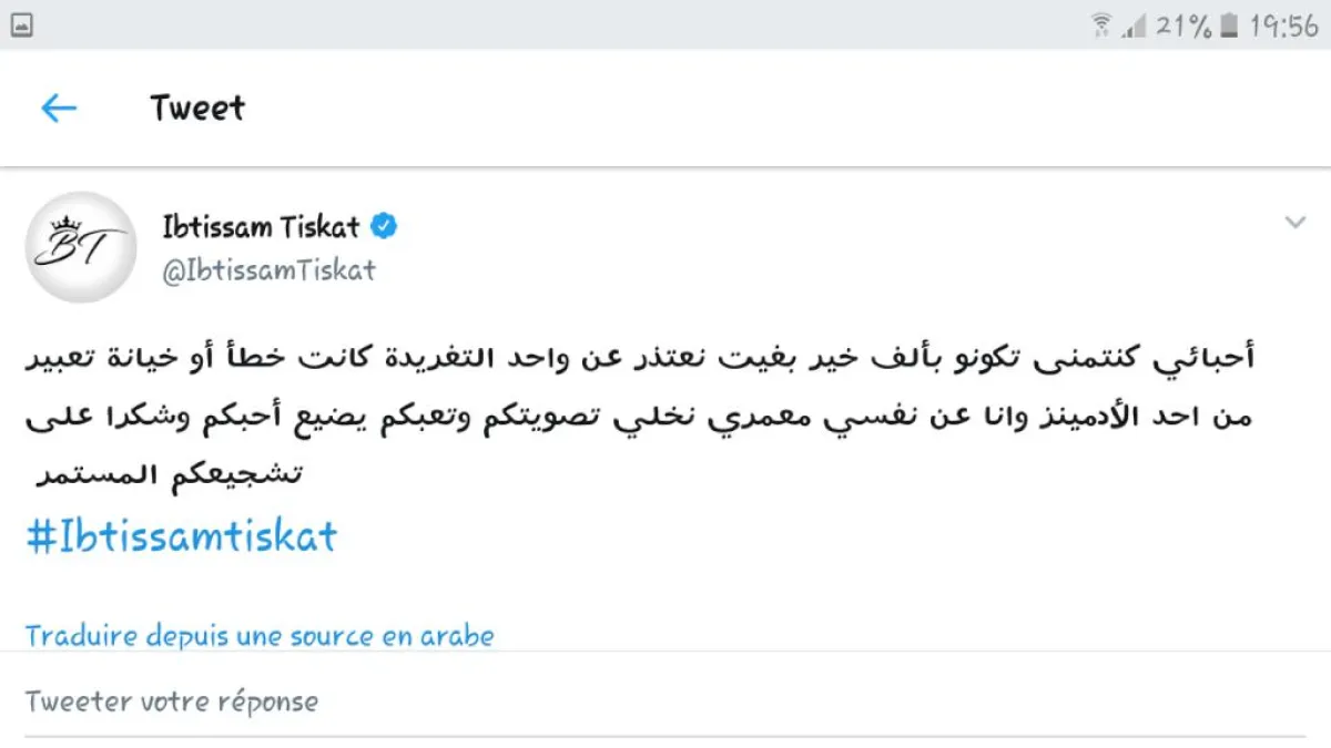 ونشرت ابتسام تسكت تغريدة عبر حسابها الرسمي على موقع التواصل الاجتماعي "تويتر"، عبّرت فيه عن أسفها جاء فيها: "أحبائي نتمنى تكونو بألف خير، بغيت نعتذر عن واحد التغريدة، كانت خطأ أو خيانة تعبير من أحد الأدمينز، وأنا عن نفسي ماعمري نخلي تصويتكم وتعبكم يضيع، أحبكم وشكرًا على تشجيعكم المستمر".