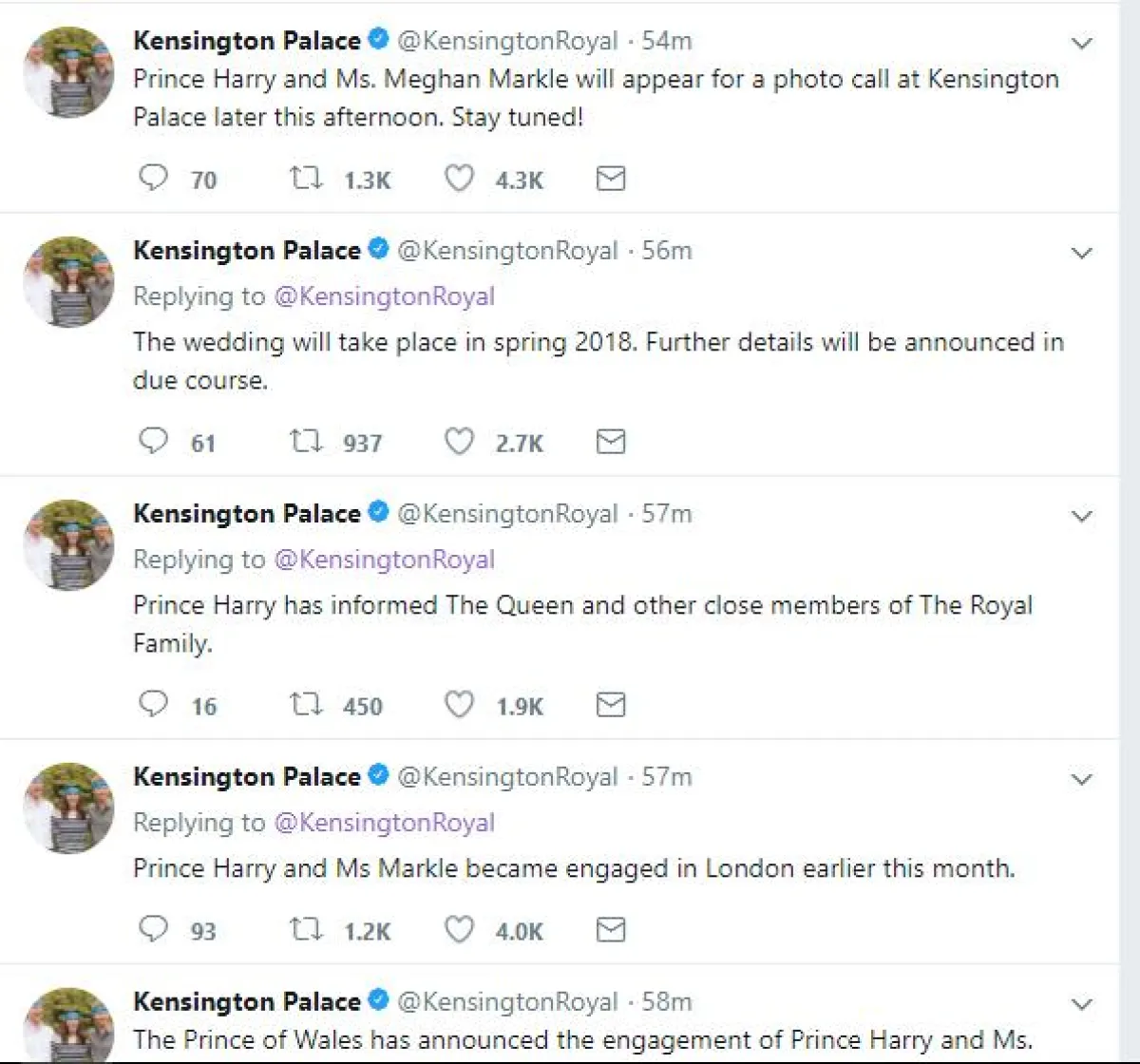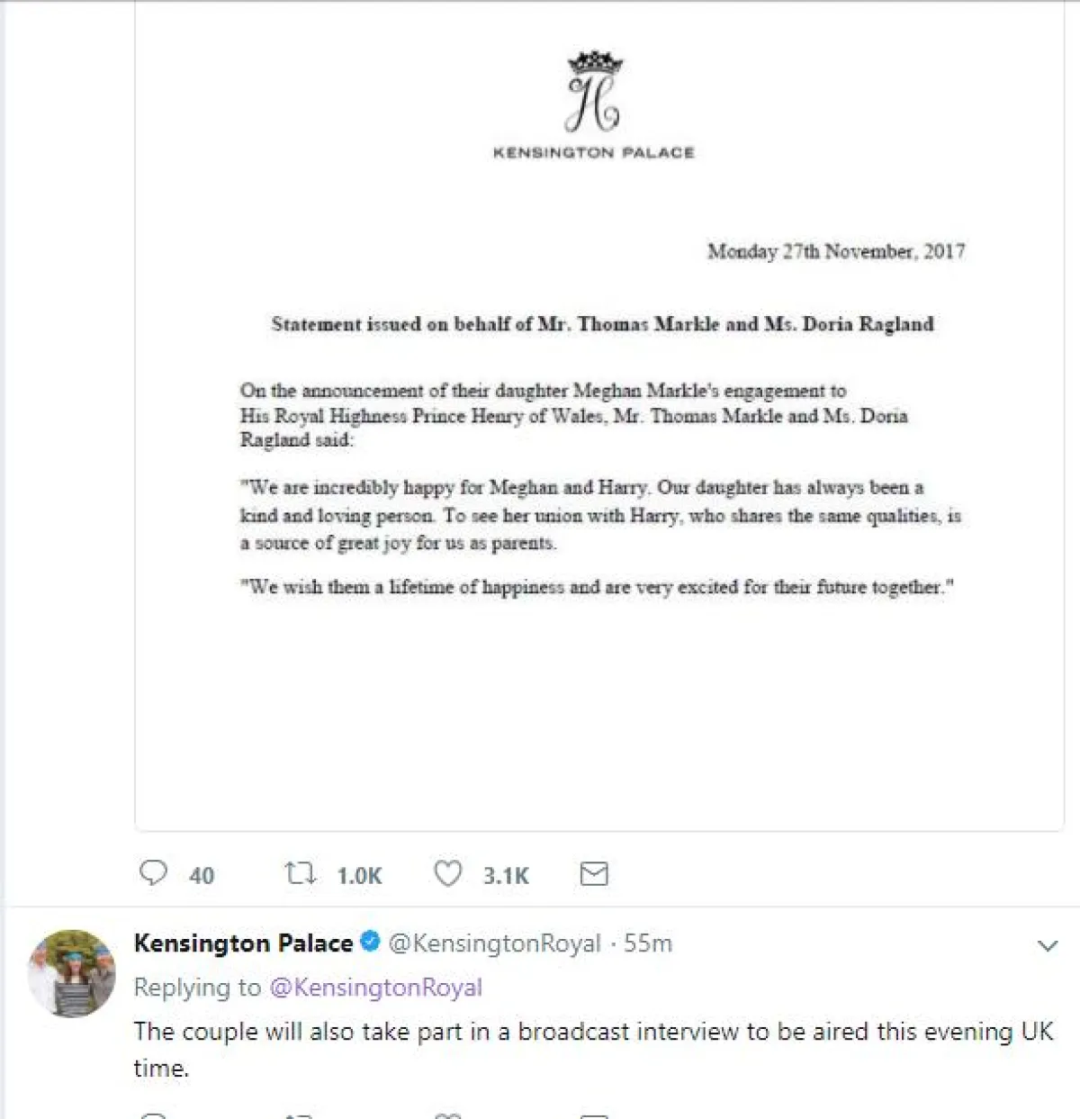 وجاء أيضًا في تغريدة أخرى، أنّ الزفاف المرتقب سيكون في ربيع عام 2018، على أن يعلن عن التفاصيل الأخرى لاحقًا، كما أنّ الثنائي سيطلان سويًّا في مقابلة على الهواء الليلة، فيما سيلتقطان صورة رسمية لهما مساء يوم غد الثلاثاء 28 نوفمبر 2017.