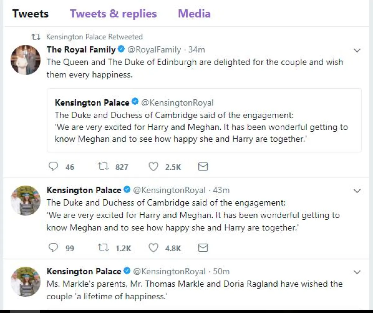 وقد نشر حساب قصر كينغستون على تويتر تغريدات عدة أكد فيها الخطوبة، وموافقة العائلة المالكة وعائلة الممثلة.
