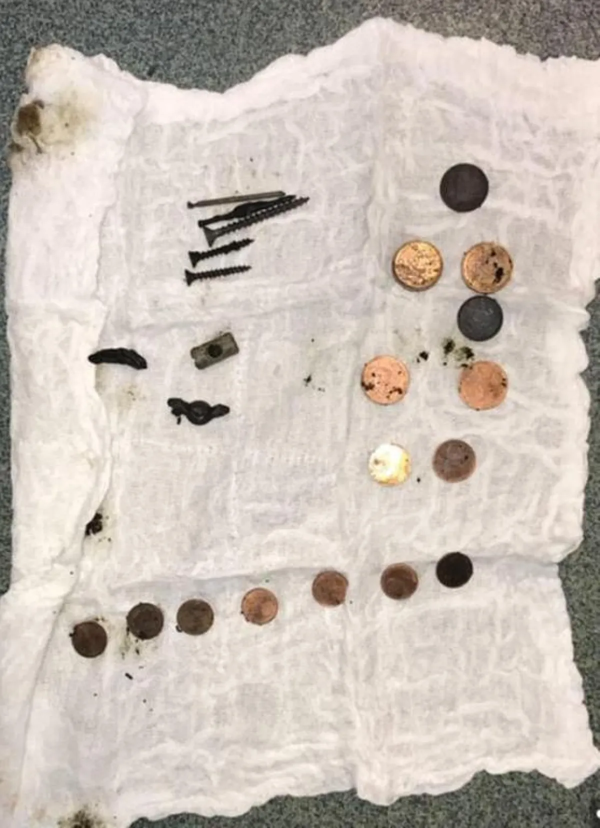 عثر الأطباء على العديد من النقود المعدنية والمسامير والبراغي والصامولات وغيرها