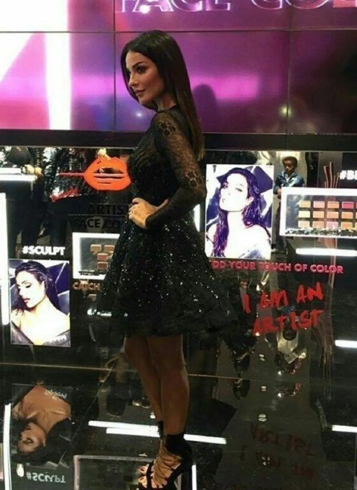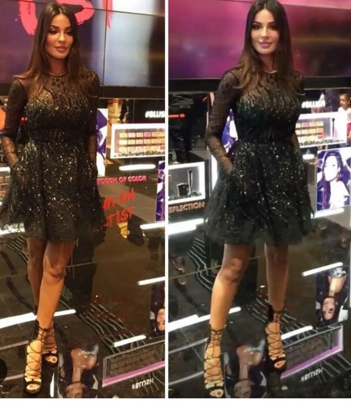 وكشف الفستان القصير باللون الأسود لزهير مراد، قوام نادين الرشيق، إلى جانب الحذاء الأسود الأنيق.