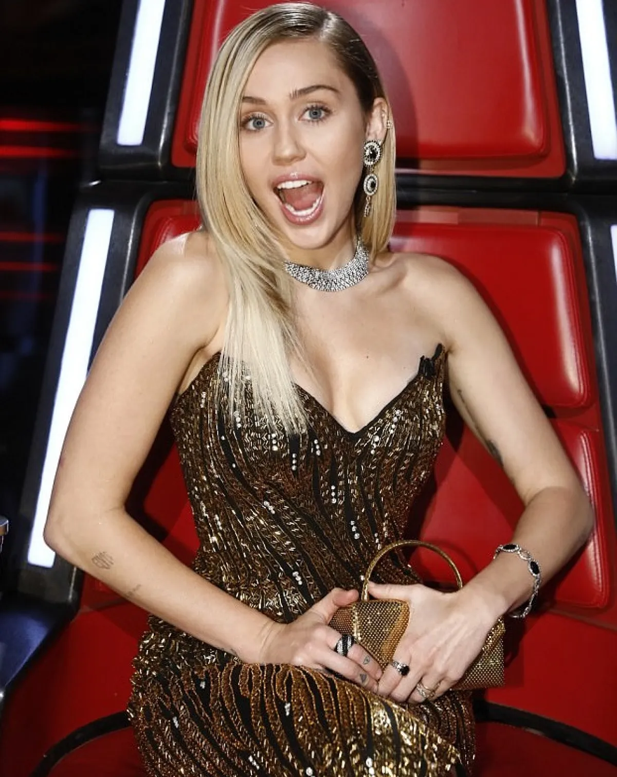 فقد ظهرت مايلي في برنامج The Voice بنسخته الأمريكية، بفستان مميز باللونين الذهبي والأسود من تصميم Bob Mackie.