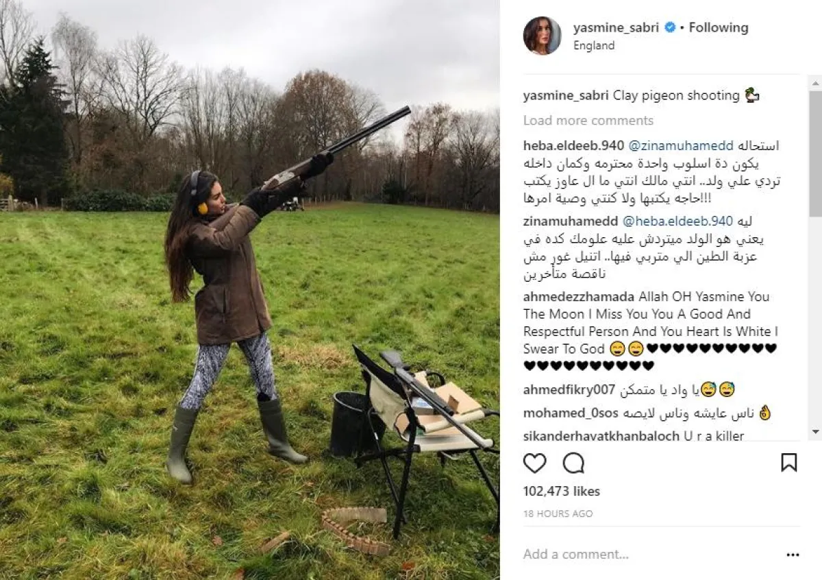 نشرت الفنانة ياسمين صبري مقطعاً مصوراً لها أثناء أداء تدريبات الرماية بالبندقية الخرطوش داخل انكلترا، وقامت بوضع التعريف الصحيح للتدريب وهو "صيد الحمام بالطين" لتتلقى بعدها وابلاً من الاتهامات بالدموية والقسوة، رغم توضيح أحد المتخصصين أن التدريب يتم على مجموعة من الأطواق البلاستيكية يطلق عليها "الحمام" في كل لغات العالم!!