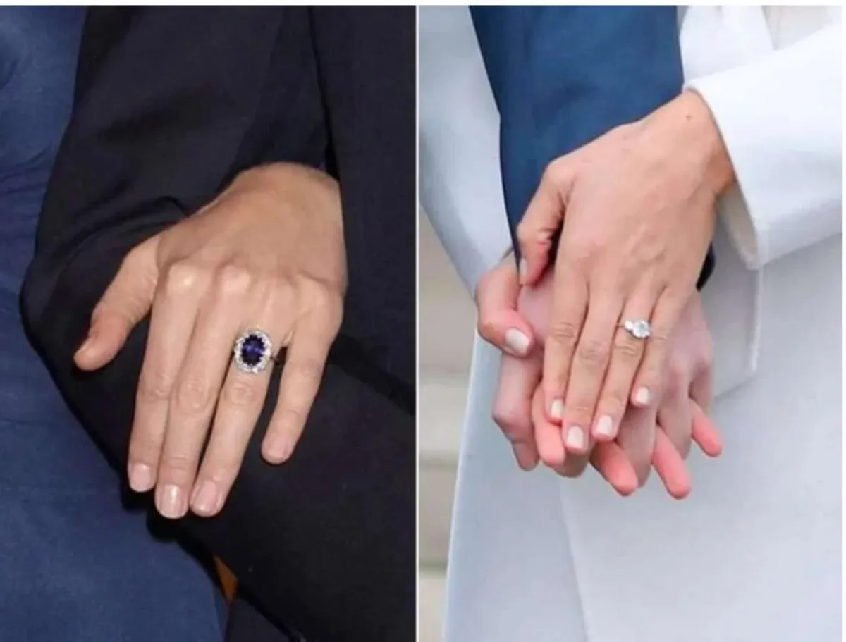 اختلف خاتم كيت عن خاتم ميغان بشكل واضح، وجميعنا يعلم أن الأمير وليام قدم لخطيبته خاتم والدته الأميرة الراحلة ديانا، وهو خاتم «سوليتير» من الذهب الأبيض المرصع بـ 14 قطعة من الماس المحاط بحجر الياقوت الكبير. أما خاتم ماركل فهو من مجوهرات ديانا أيضًا ولكنه ليس إرثا، بل صممه هاري بنفسه، وتم تصنيعه في مؤسسة كورت للمجوهرات الملكية، وهو مكون من قطعتين من الماس من مجوهرات الأميرة ديانا والباقي من بوتسوانا. وهو البلد الذي يحتل مكانة خاصة في قلوب الخطيبين.
