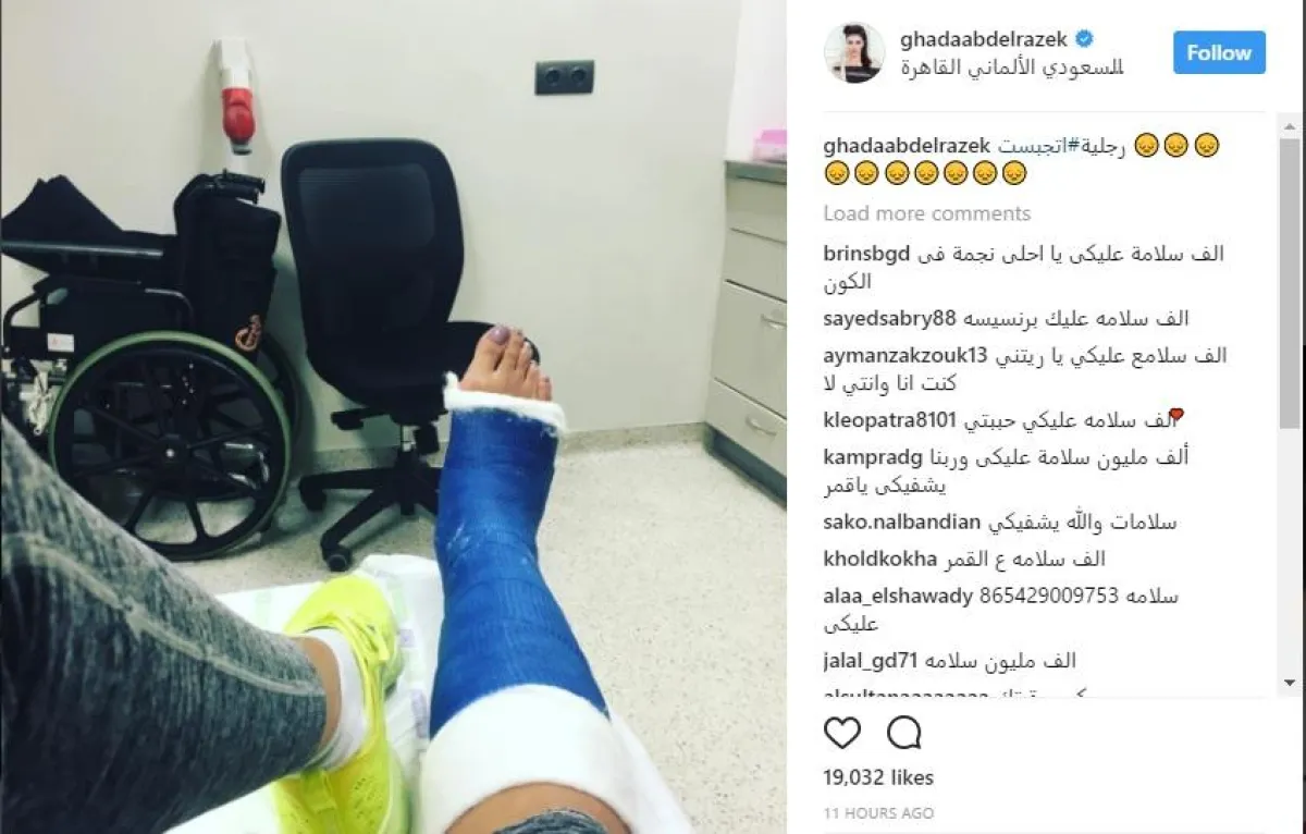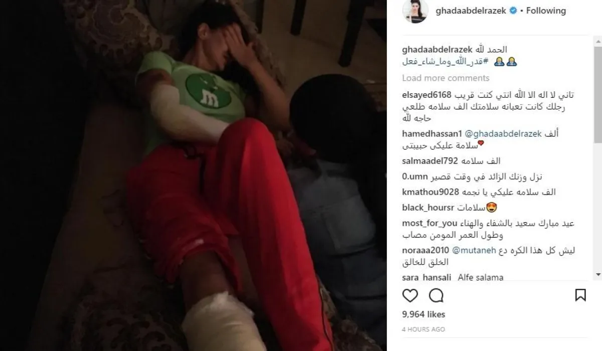 الصورة التي حذفتها غادة هي تلك التي تظهر فيها بعد إصابتها في ساقها وذراعها وتبدو فيها بعد تركيب الجبائر الجبسية، وتلقت الفنانة الشهيرة عليها العديد من التعليقات التي تواسيها على الإصابة الجديدة وتشدّ من أزرها، فيما أكد البعض أنها محسودة.