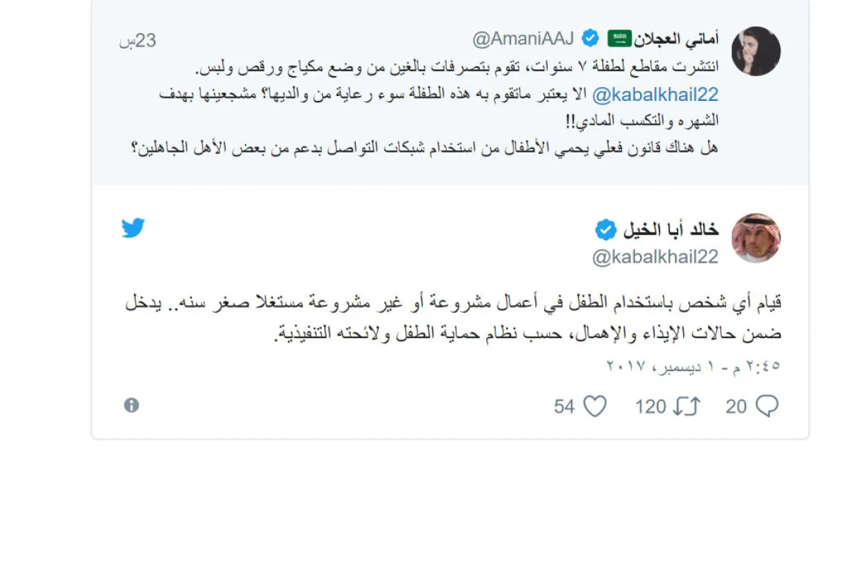 بعد انتقادات عدة تم توجيهها عبر مواقع التواصل الاجتماعي في السعودية عقب تداول مقاطع فيديو لطفلة، تبلغ من العمر ٧ أعوام، وهي تضع المكياج، وترتدي ملابس غير لائقة، ما أثار غضب المغردين عبر "تويتر "، الذين طالبوا بمحاسبة ناشري تلك المقاطع والسماح للطفلة بأن تظهر بتلك الصورة التي تسلب منها براءتها، متهمين عائلتها بالترويج لها بغرض الكسب المادي والشهرة السريعة عبر مواقع التواصل الاجتماعي، أكد المتحدث الرسمي باسم وزارة العمل والتنمية الاجتماعية خالد أبا الخيل، عبر حسابه الموثق في "تويتر"، أن استخدام الوالدين أو أي شخص آخر الأطفال للقيام بأعمال مشروعة، أو غير مشروعة، واستغلال صغر سنهم للقيام بذلك، يعد مخالفة لنظام حماية الطفل من الإيذاء ولائحته التنفيذية.