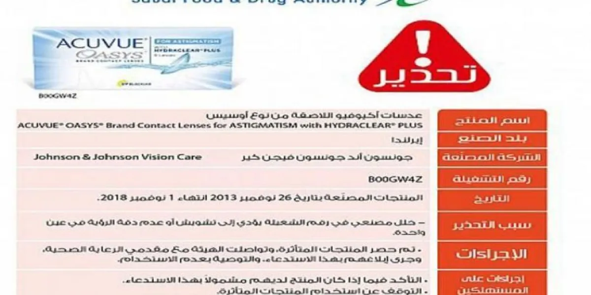 بسبب وجود خلل مصنعي في رقم التشغيلة، حذَّرت الهيئة العامة للغذاء والدواء السعودية من استخدام عدسات "أكيوفيو" اللاصقة من نوع أوسيس (ACUVUE® OASYS® Brand Contact Lenses for ASTIGMATISM with HYDRACLEAR® PLUS)، ذات التشغيلة رقم (B00GW4Z)، التي ينتجها مصنع جونسون آند جونسون فيجن كير (Johnson & Johnson Vision Care) في إيرلندا.