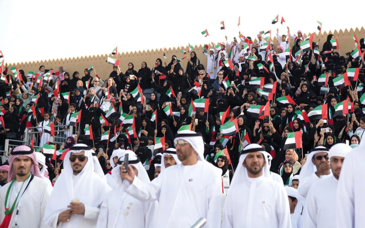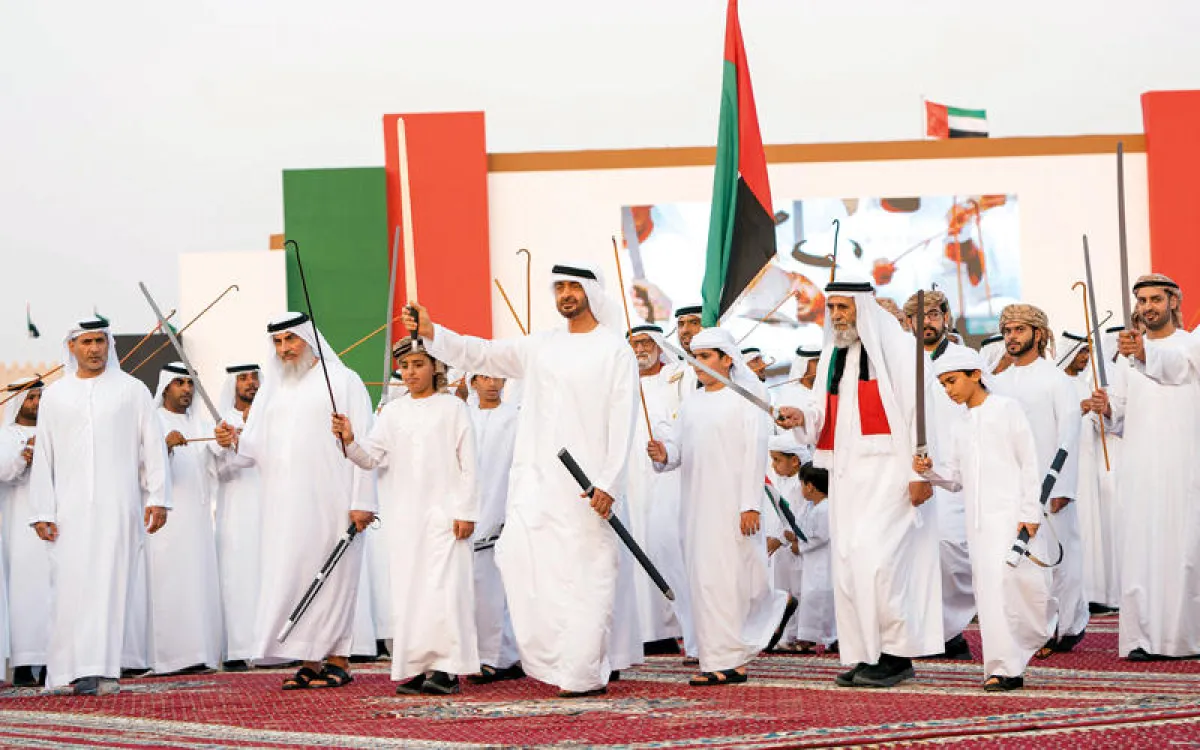شارك الشيخ محمد بن زايد آل نهيان، ولي عهد أبوظبي نائب القائد الأعلى للقوات المسلحة، أبناء الإمارات فرحتهم باليوم الوطني، إذ أدى لوحة العيالة، وشاركه عدد من الشيوخ، معبّرين عن اعتزازهم وفخرهم بهذه المناسبة الوطنية المجيدة، وبمنجزات الوطن وأبنائه الأوفياء.