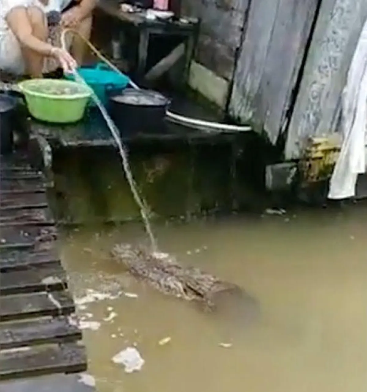 ولم تُظهر السيدة أي تخوف من التمساح، وألقت إليه جزءًا من المأكولات البحرية التي كانت تنظفها لطبخها.