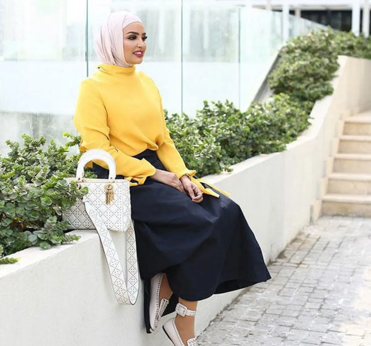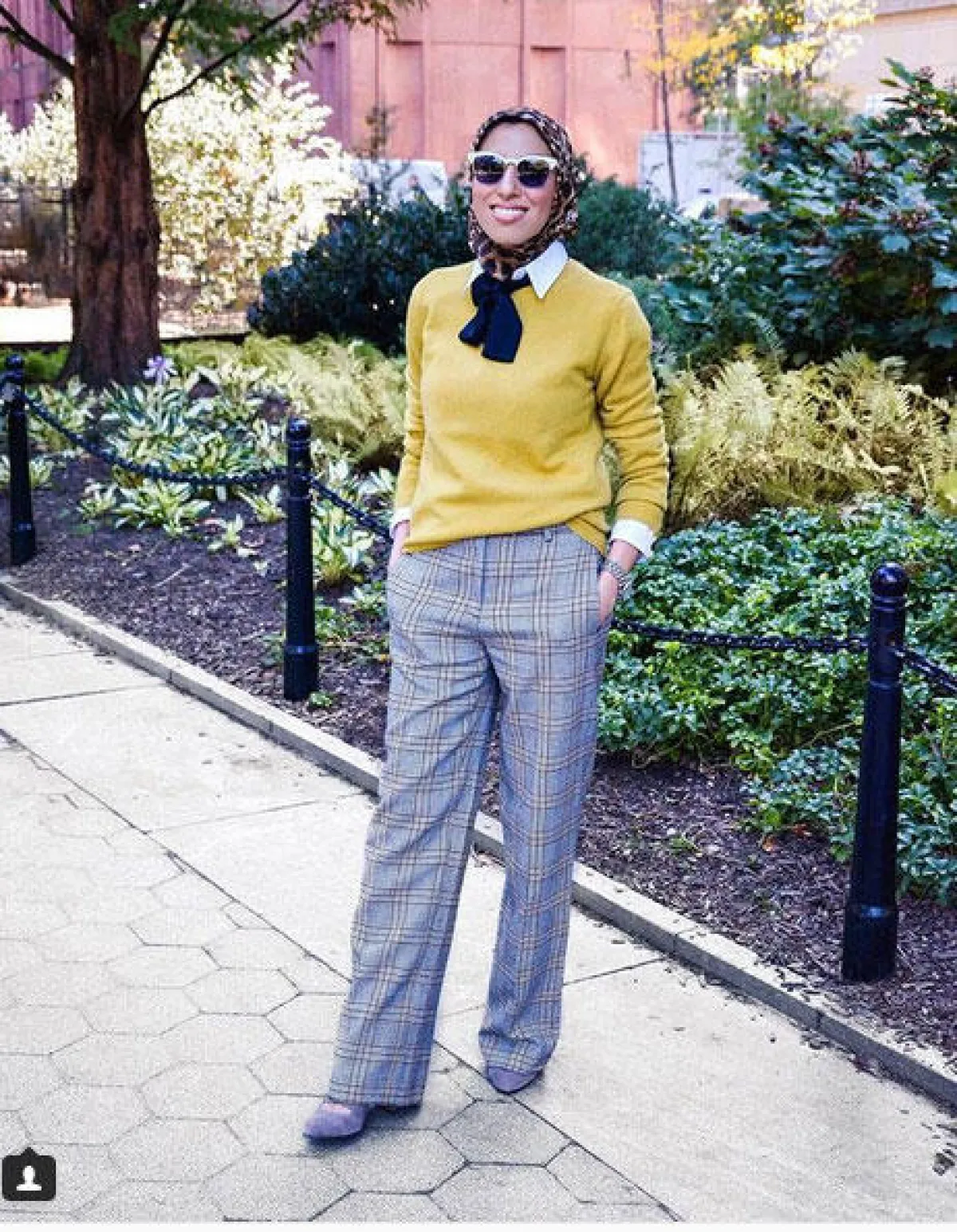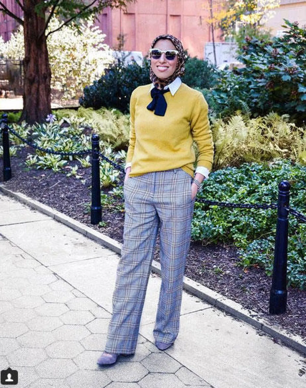 أما إذا كنتِ لا تفضلين أن يكون اللون الأصفر هو الأساسي في إطلالتك، فيمكنك الاكتفاء ببلوفر أو كنزة تحتية بسيطة بالأصفر مع سترة بلون مناسب لها على طريقة الفاشينيستا زينب حمود.
