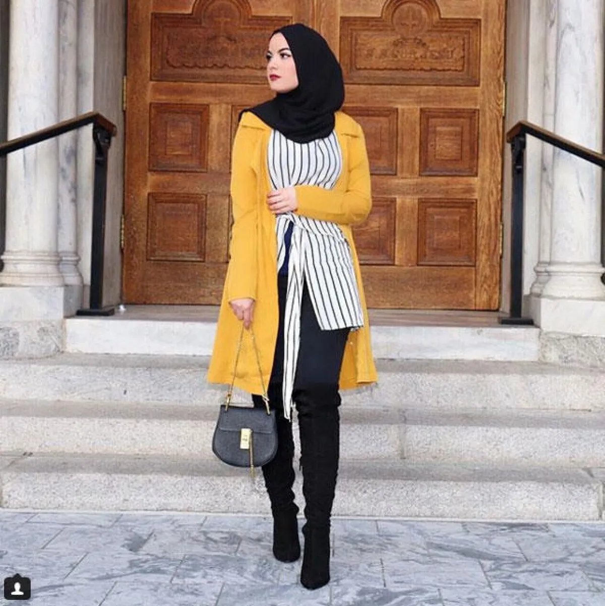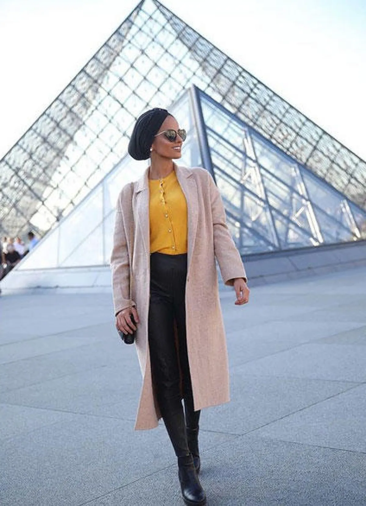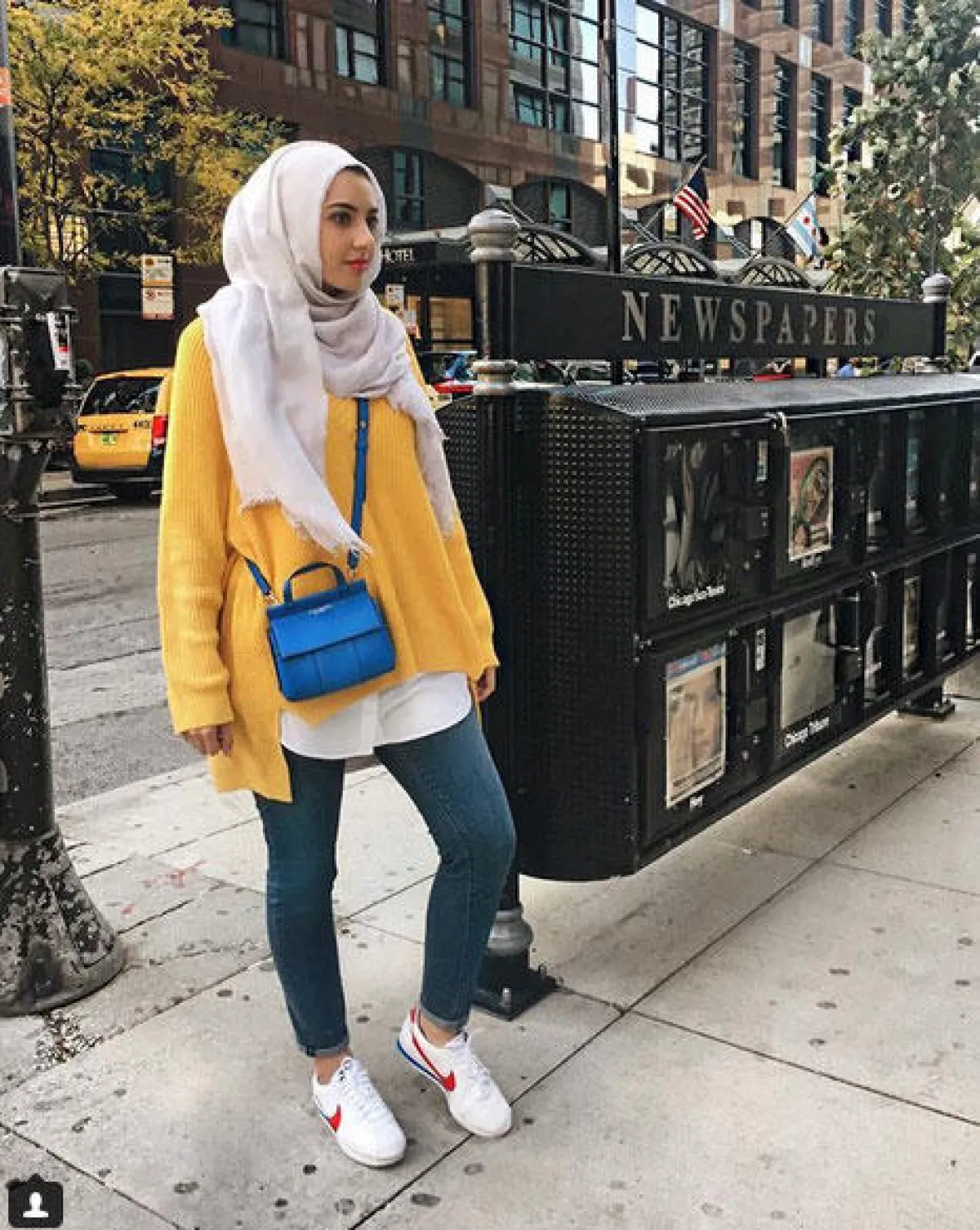 أما إذا كنتِ لا تفضلين أن يكون اللون الأصفر هو الأساسي في إطلالتك، فيمكنك الاكتفاء ببلوفر أو كنزة تحتية بسيطة بالأصفر مع سترة بلون مناسب لها على طريقة الفاشينيستا زينب حمود.