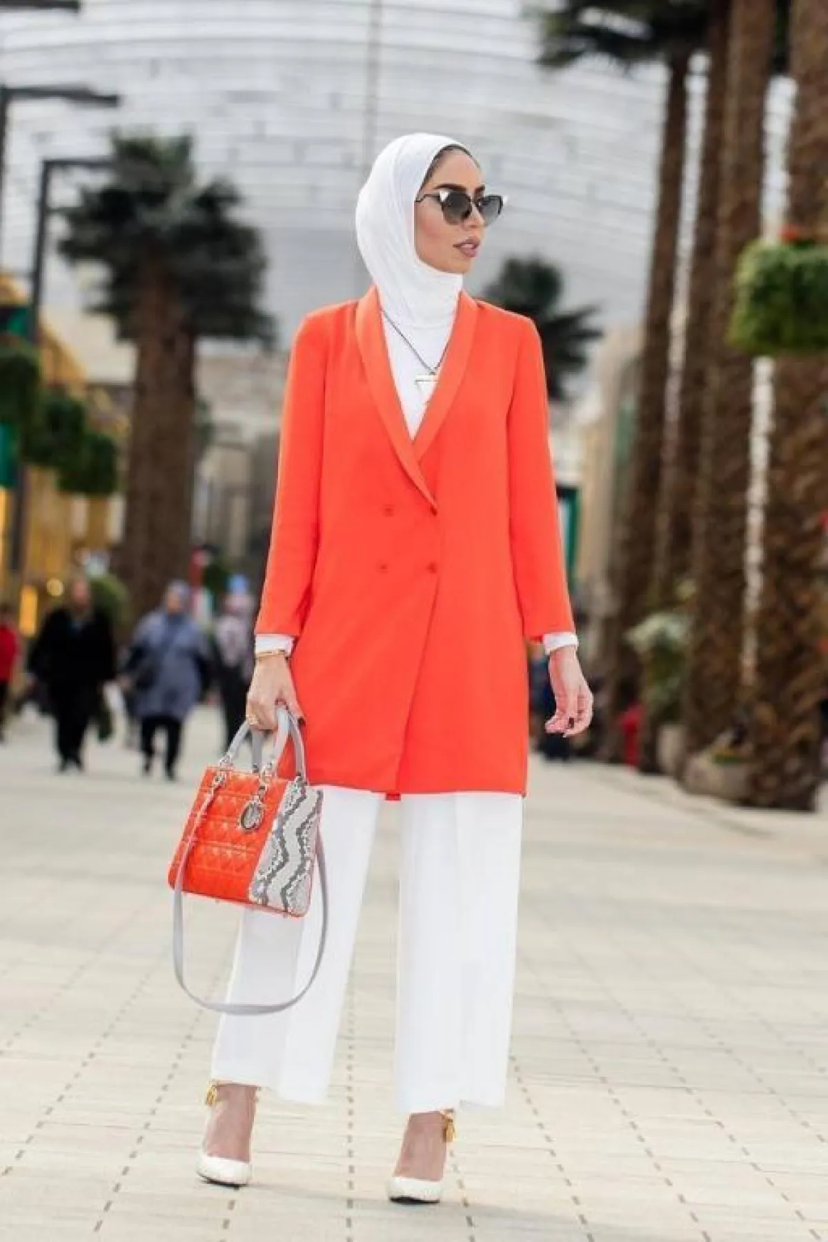 ظهرت الدرجات الداكنة من البرتقالي هذا الموسم، سواء البلوفر أو المعطف أو البليزر، والتي يمكن تنسيقها مع أزياء باللون الأسود أو الأبيض في إطلالات النهار.