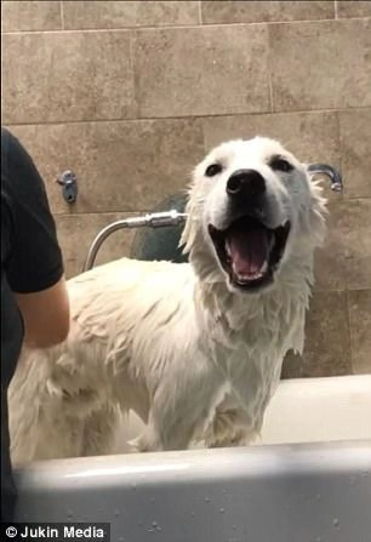 وطبقاً للفيديو الذي نشرته صحيفة «ديلي ميل» البريطانية ظهر الكلب سعيداً مستمتعاً بالاستحمام وهو ينادي على صاحبته «ياماما» بشكل متكرر.