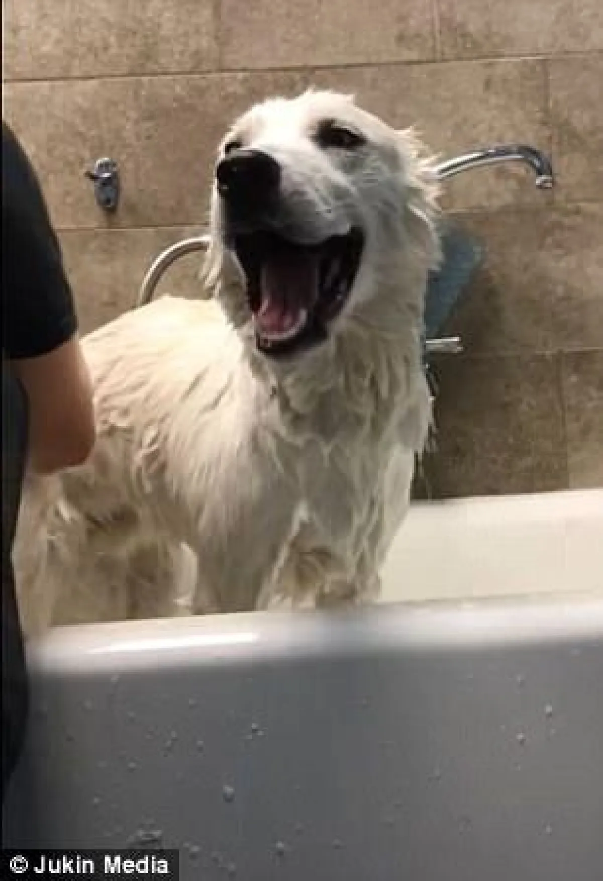 أظهر فيديو طريف لحظة رائعة لكلب تقوم الأسرة التي تأويه بتنظيفه داخل البانيو الموجود بحمام المنزل فتنسكب عليه المياه وهو مستمتعاً لينادي صاحبته بلقب «يا ماما».