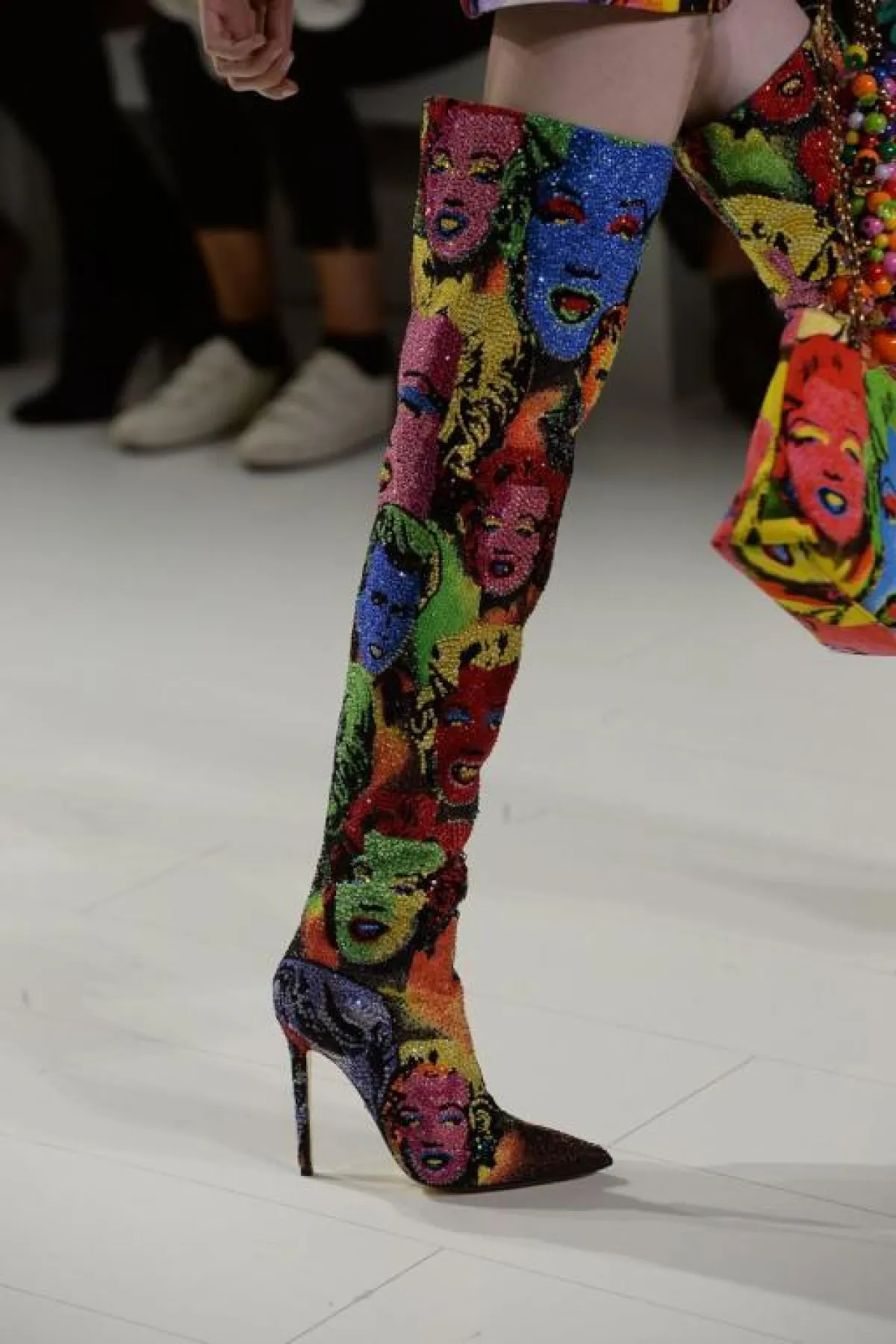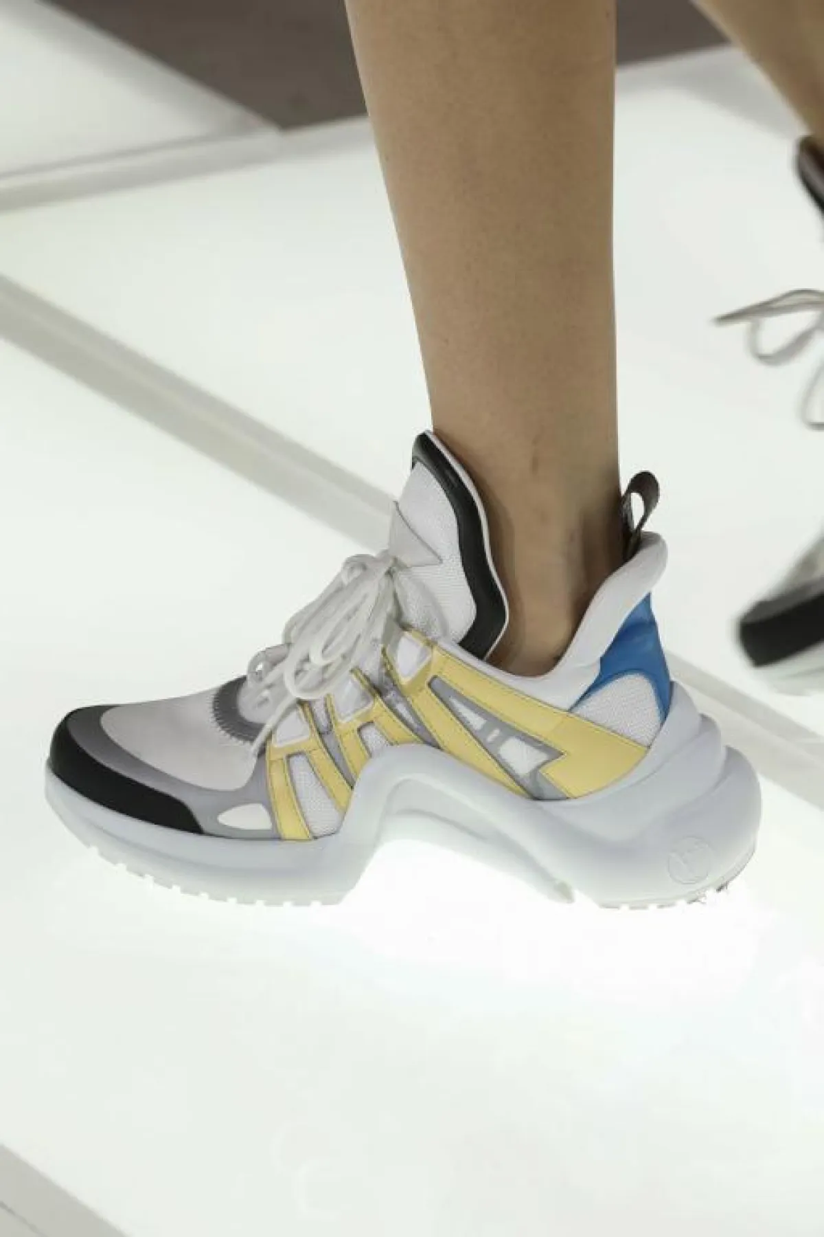 وبالمقابل شاهدنا التصاميم العصرية مثل الاكسسوارات البلاستيكية لدى "شانيل" Chanel، والأحذية الرياضية لدى "لويس فويتون" Louis Vuitton، وجزمات الجوارب الملونة لدى "بالنسياغا" Balenciaga.