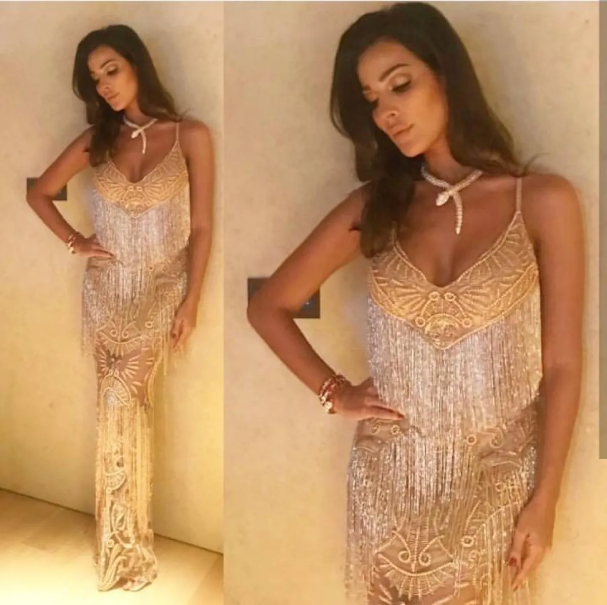 اطلالة نادين لفتت أنظار الحضور إليها، نظرًا لأناقة تصميمها وجرأتها بسبب صدرها المكشوف، وتميز الفستان بلونه الذهبي المصمّم من السلاسل الرفيعة، التي أضفت عليه لمستها العصرية.